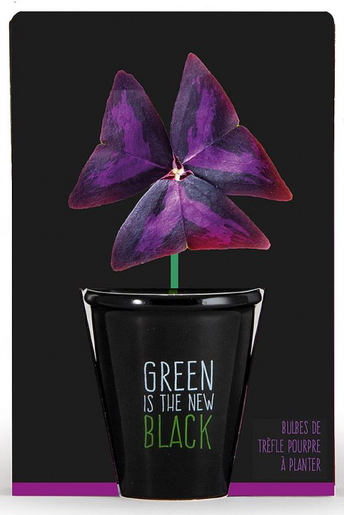 - Un ghiveci din ceramică, negru, diametru 6 cm în partea de sus, inscripționat cu mesajul "Green in the new black"