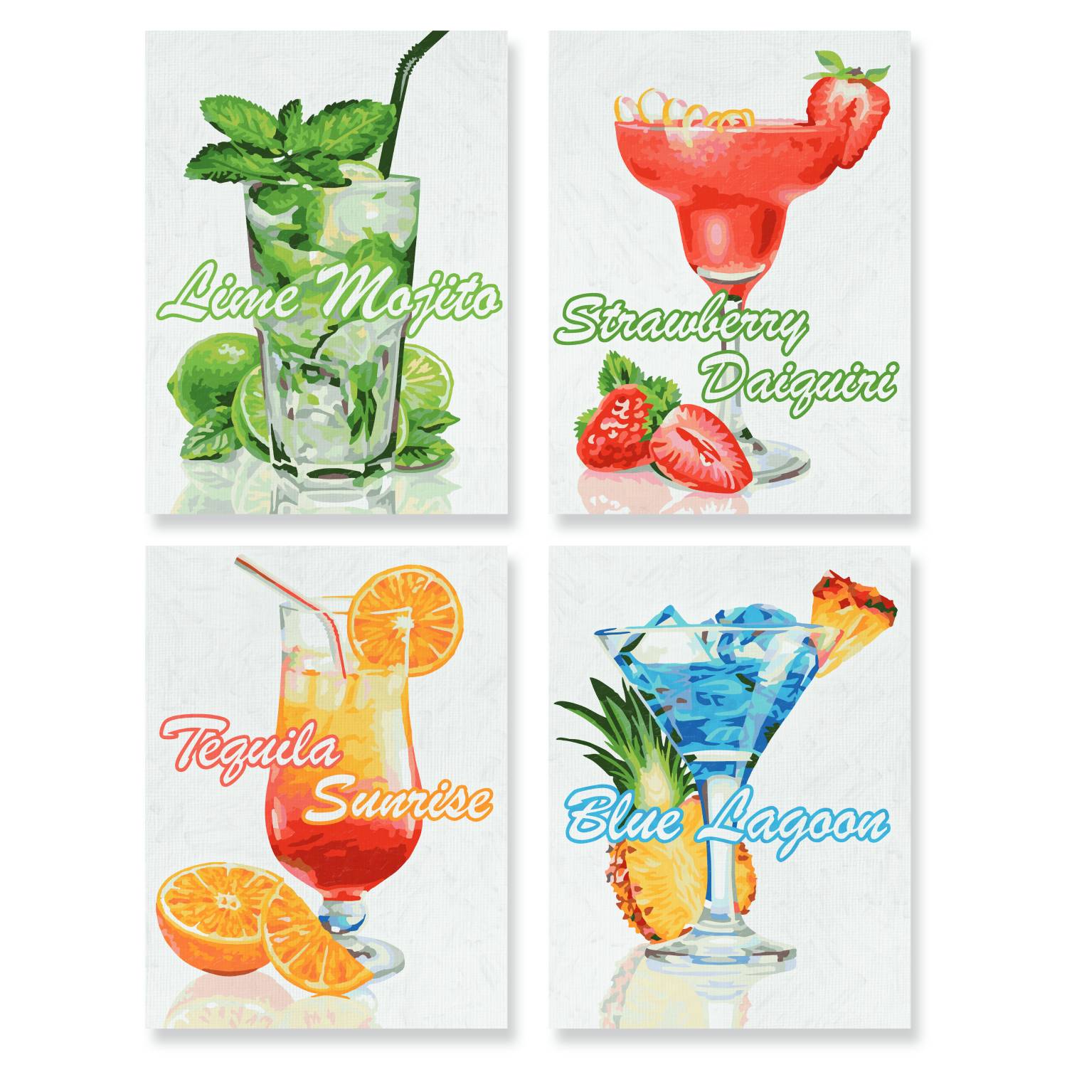 Acest set de pictură pe numere este format din 4 tablouri din carton cu textură de pânză.