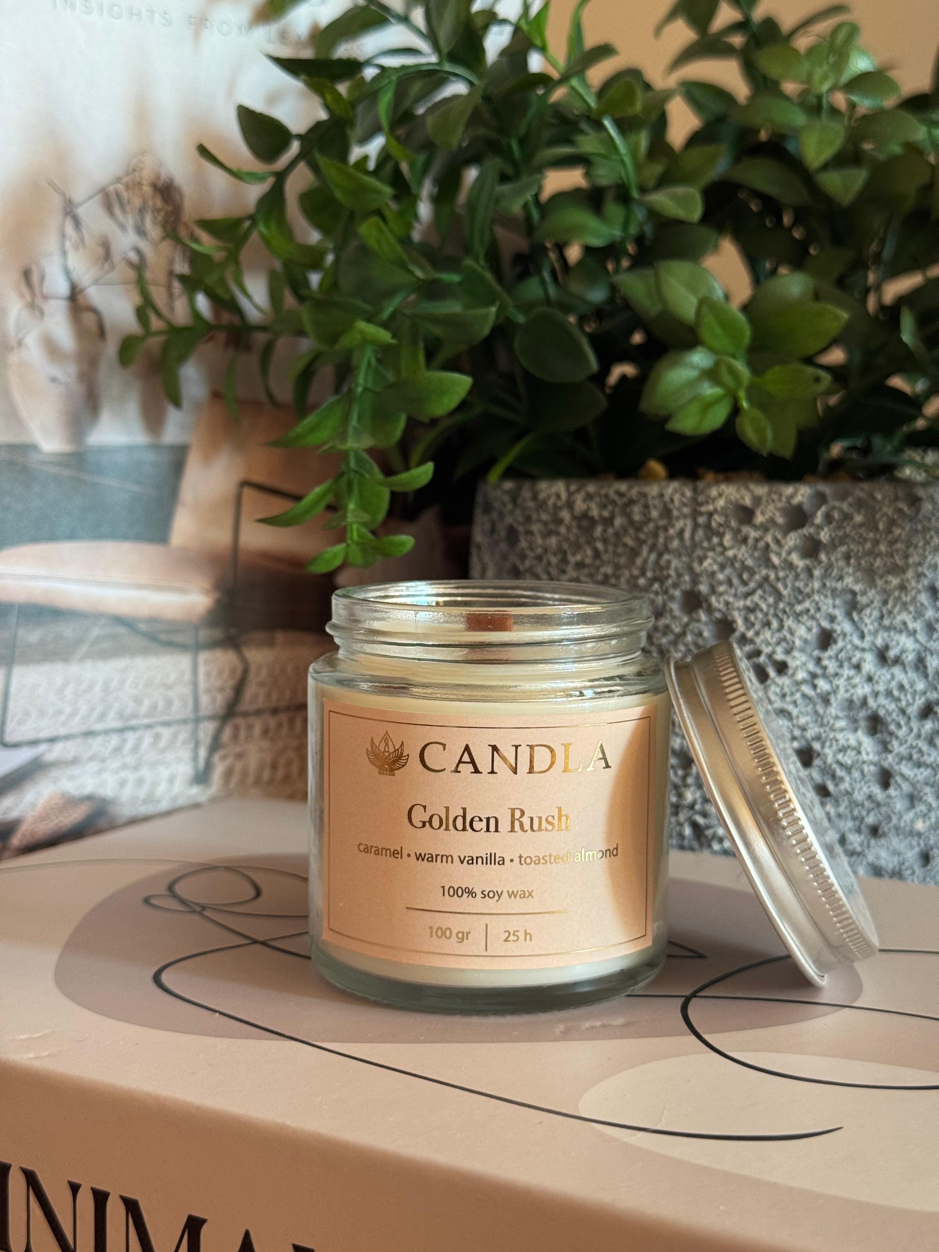 Lumanare parfumata din soia cu minerale, aroma de caramel si fitil de lemn.