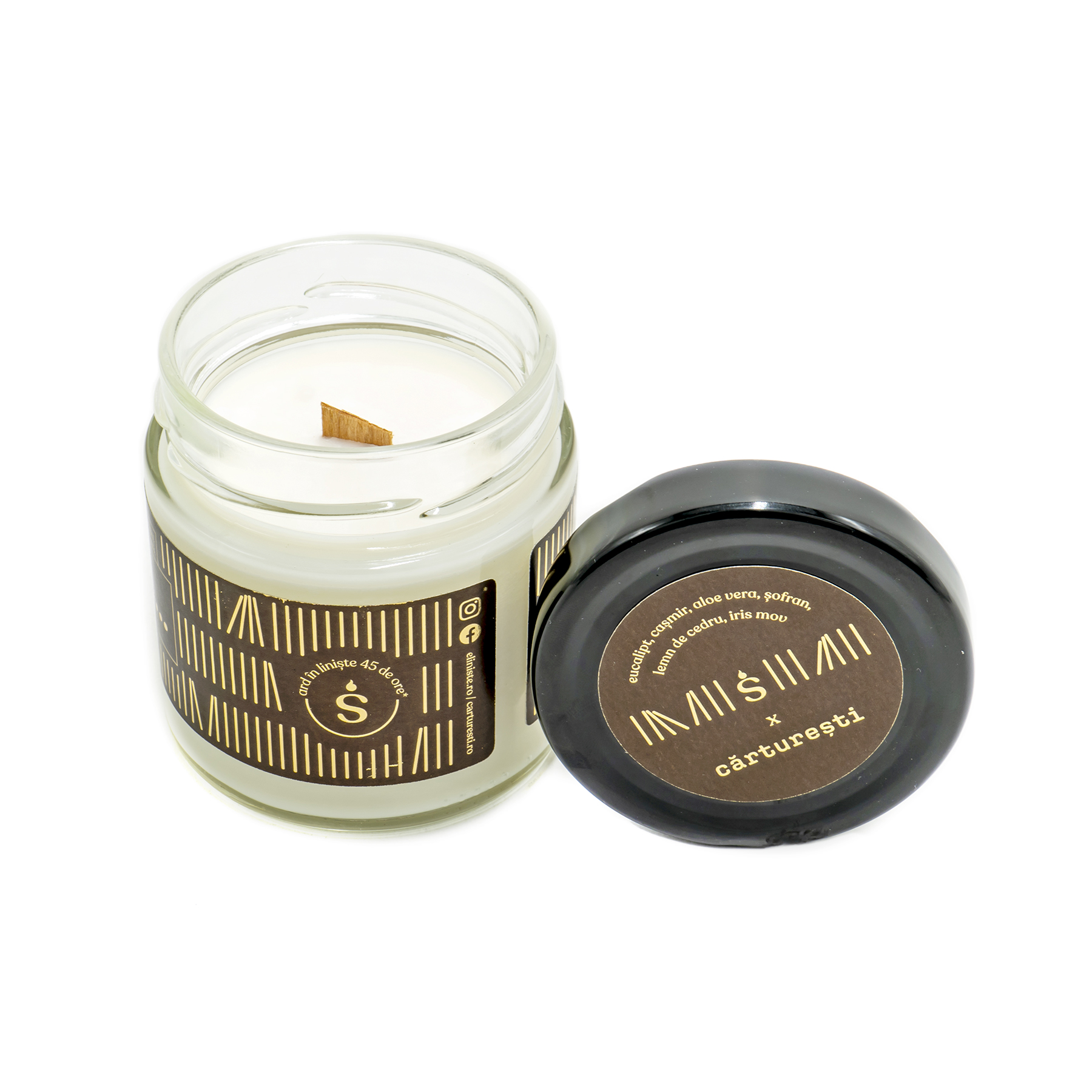 Shhhhhhh…e momentul pentru citit e o lumânare parfumată marca Liniște x Cărturești, din ceară pură de soia. Lumânarea are 180 g, cu timp de ardere de 40h și fitil din lemn, care la aprindere imită sunetul lemnelor trosnind într-un șemineu.