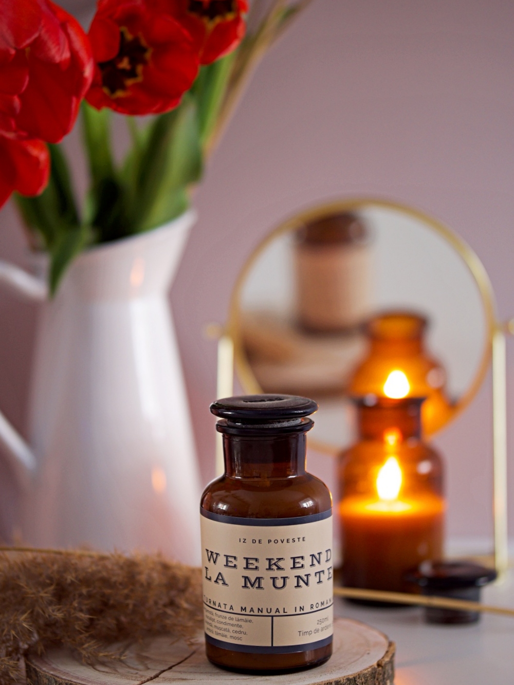 Ceară de soia mixată cu uleiuri parfumate, turnată manual în vas ambra din sticla cu capac. Nu stingeti lumanarea cu capacul si nu il lasati asezat pe aceasta imediat dupa ce a fost stinsa, pentru a evita formarea vidului si blocarea capacului.