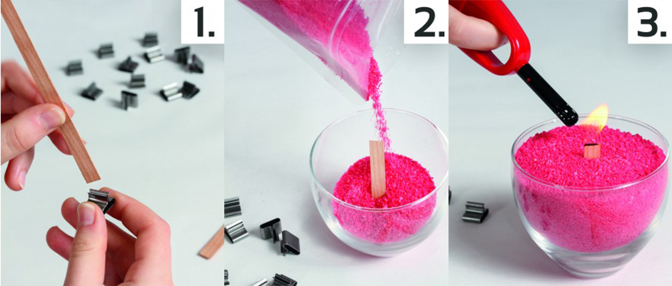 - Infigi fitilul din lemn in suportul metalic si il centrezi in mijlocul recipientului