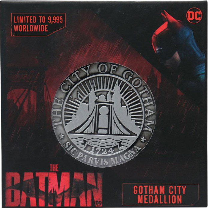 Acest medalion Gotham City este puternic embosat și este limitat la 9.995 de exemplare la nivel mondial, numerotat individual și livrat cu un suport de prezentare.