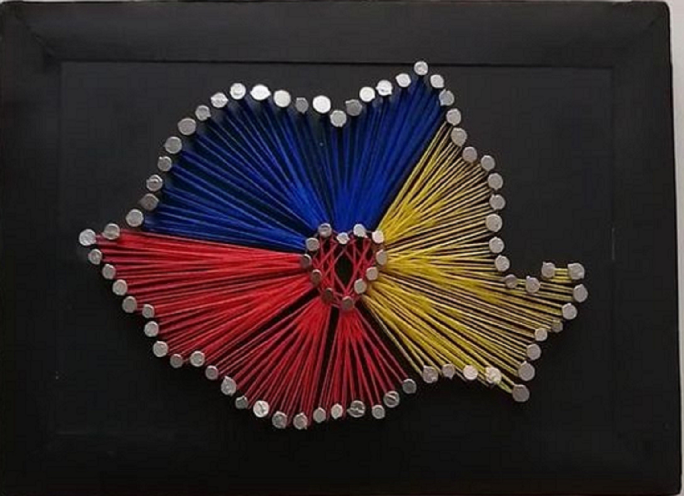 Placheta stringart confectionata din PAL, autocolant, folie cant, cuisoare, ata bumbac, pastila magnet