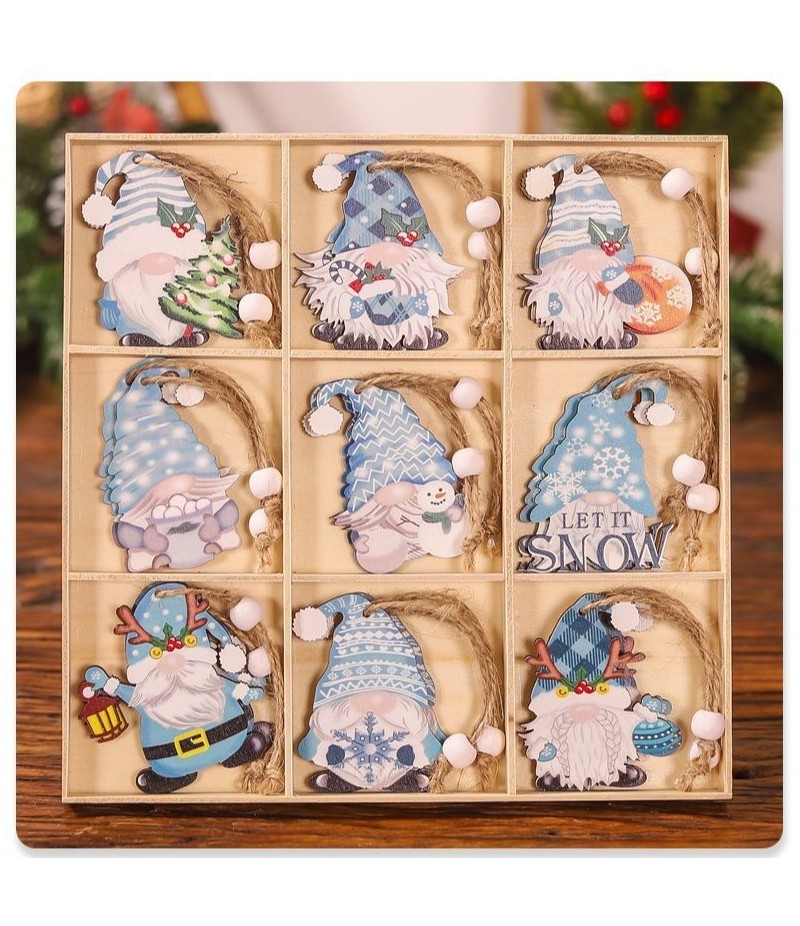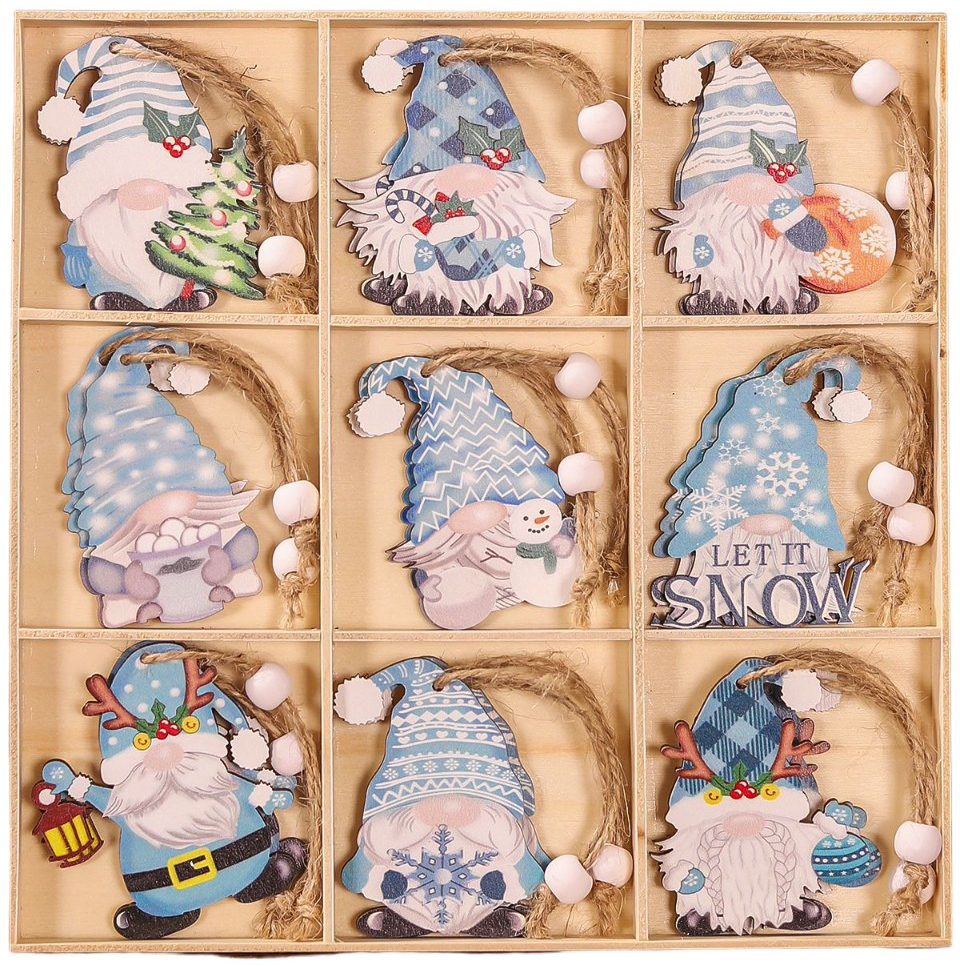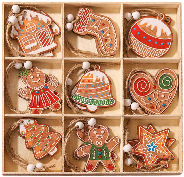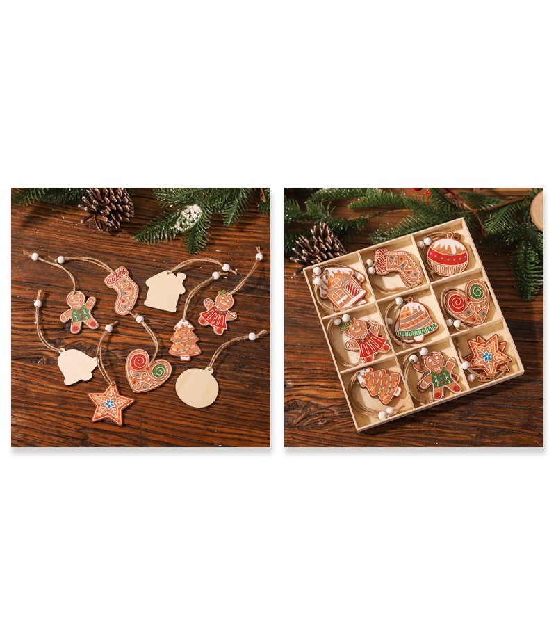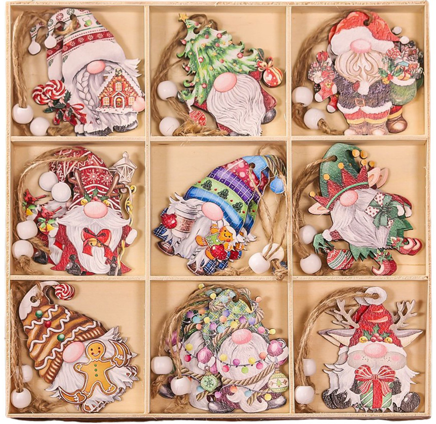 Set 18 decorațiuni pentru Crăciun, din lemn, 9 modele, câte 2 din fiecare.
