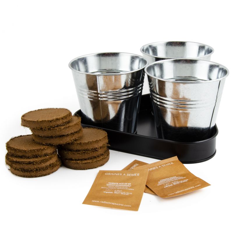 Set pentru plantat compus din 3 ghivece și trei soiuri de roșii (Roma, Marmande și Inimă de bou).