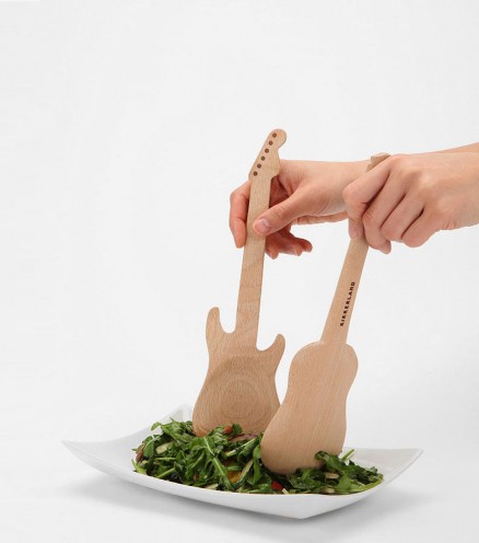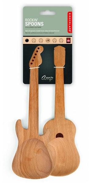 Set de doua linguri din lemn de fag, rezistente la caldura. Foloseste-le impreuna ca un cleste haios pentru salata sau separat pentru supe, sosuri si aluaturi. Acest set de linguri sub forma de chitara acustica si electrica poate fi folosit pentru vasele de gatit neaderente.