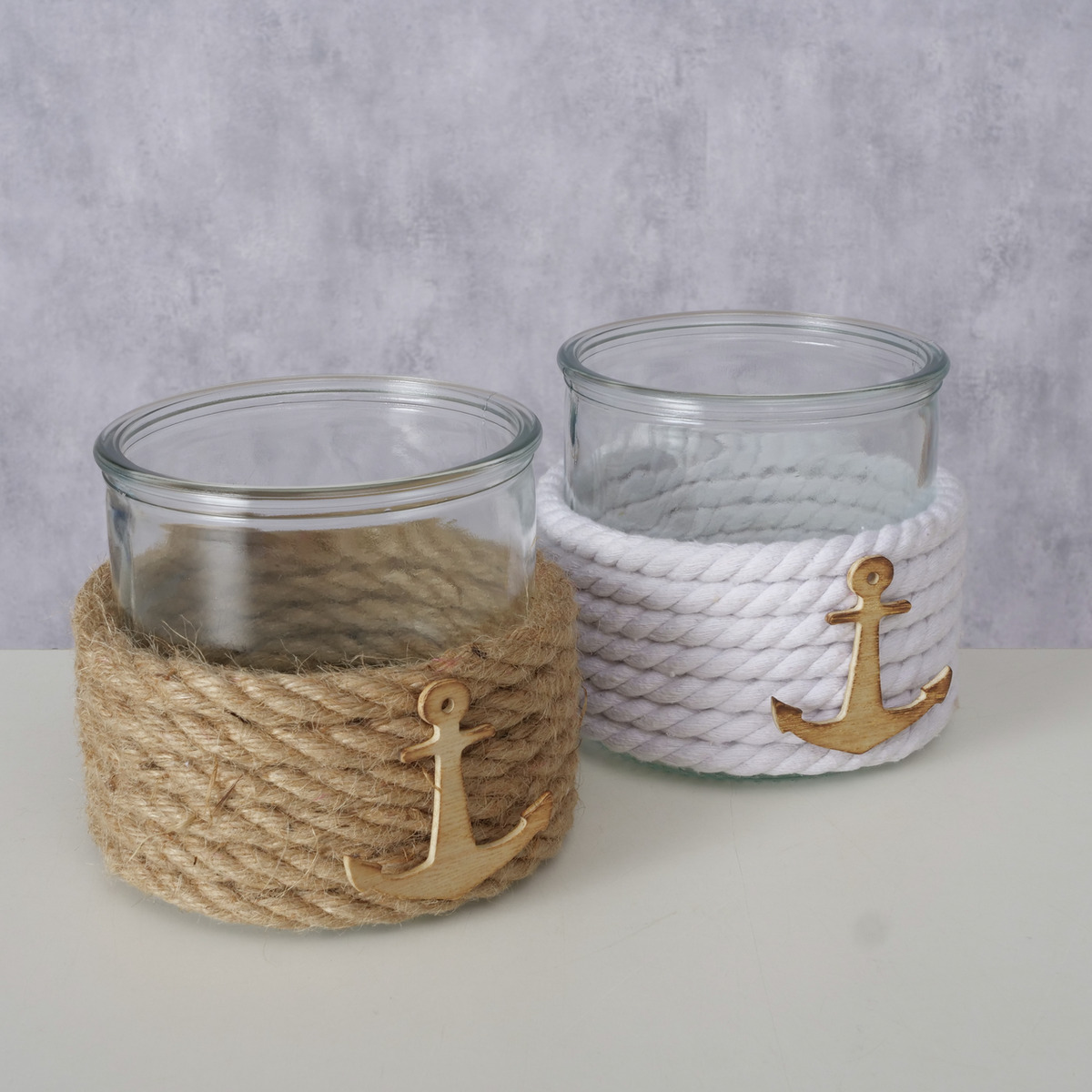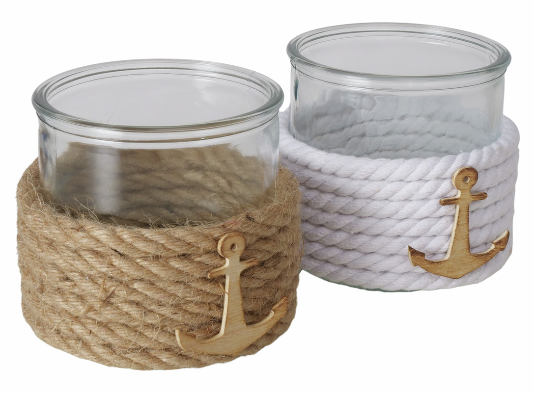 Supot de lumânare - Mares, design maritim, diametru 14 cm, fabricat din sticlă, placaj iută și bumbac.