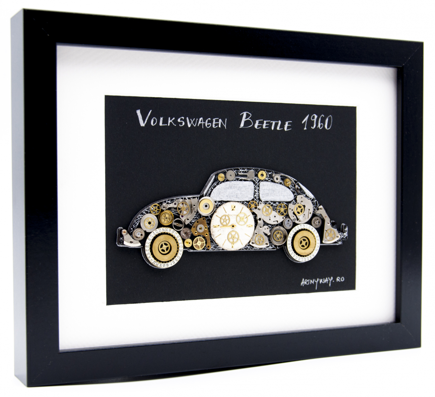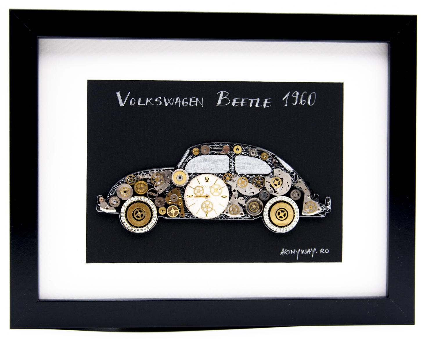 Este realizat 100% manual, cu piese si mecanisme reconditionate de ceas si diverse piese metalice aplicate pe o macheta din lemn ce respecta in totalitate dimensiunile originale ale modelului, totul fiind incadrat intr-o rama eleganta din lemn.