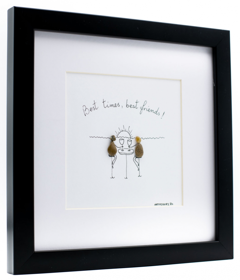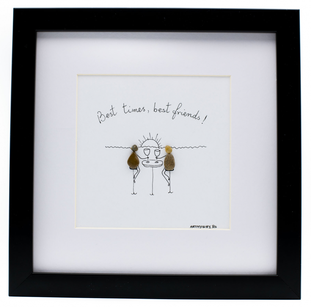 Tabloul Best Friends este realizat 100% manual din pietre naturale de diferite dimensiuni, incadrate intr-o rama neagra eleganta, cu geam de sticla. Tabloul vine insotit de certificat de garantie si de autenticitate.