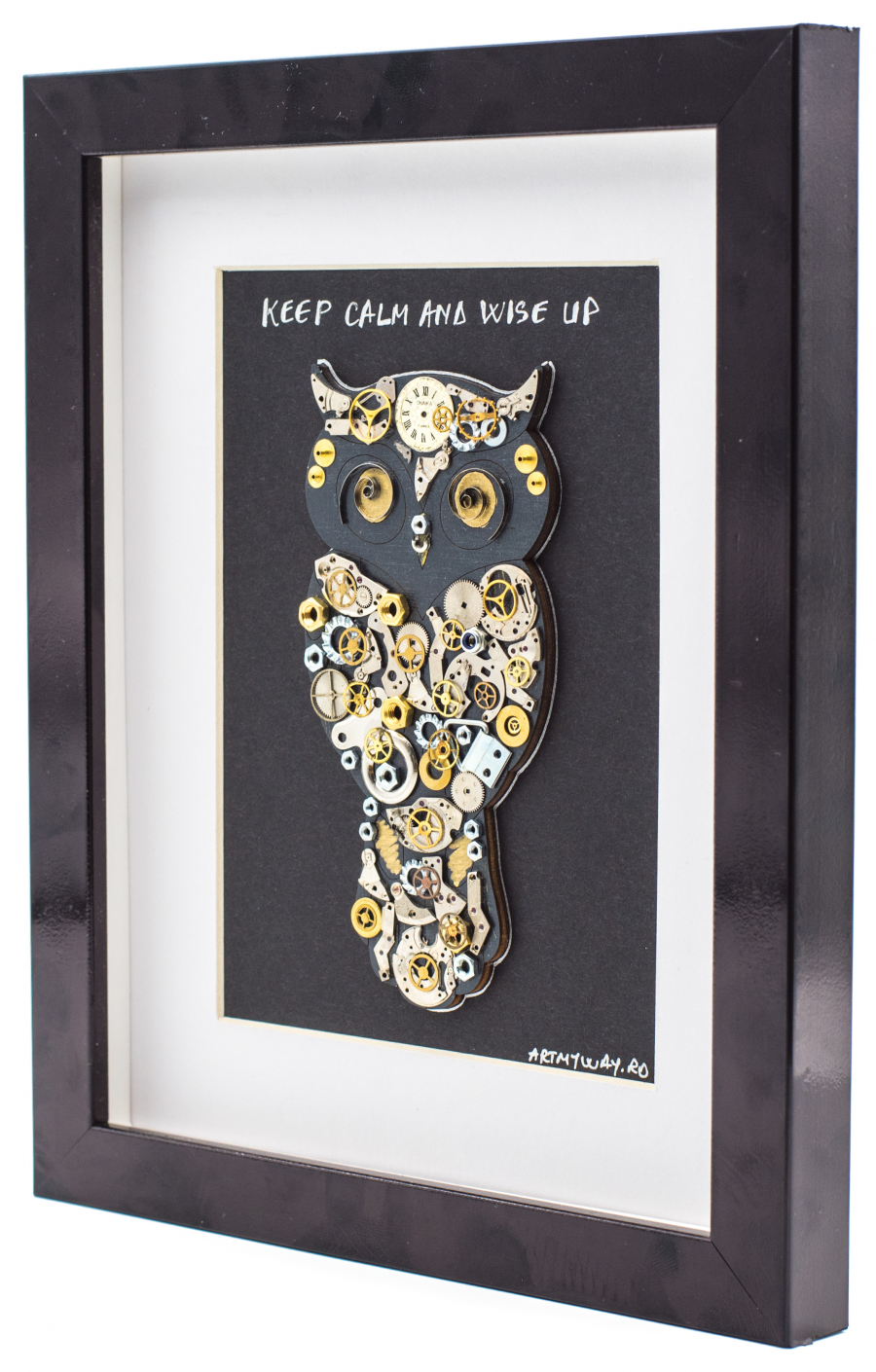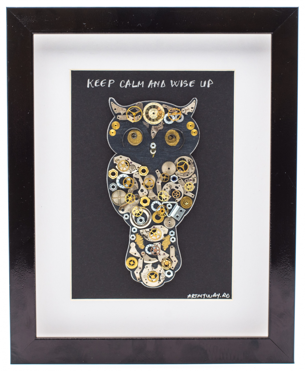 Tabloul Bufnita Keep calm and wise up este realizat manual, cu piese si mecanisme reconditionate de ceas si diverse piese metalice, toate incadrate intr-o rama eleganta neagra cu geam de sticla. Tabloul Bufnita Keep calm and wise up vine insotit de certificat de garantie si autenticitate.