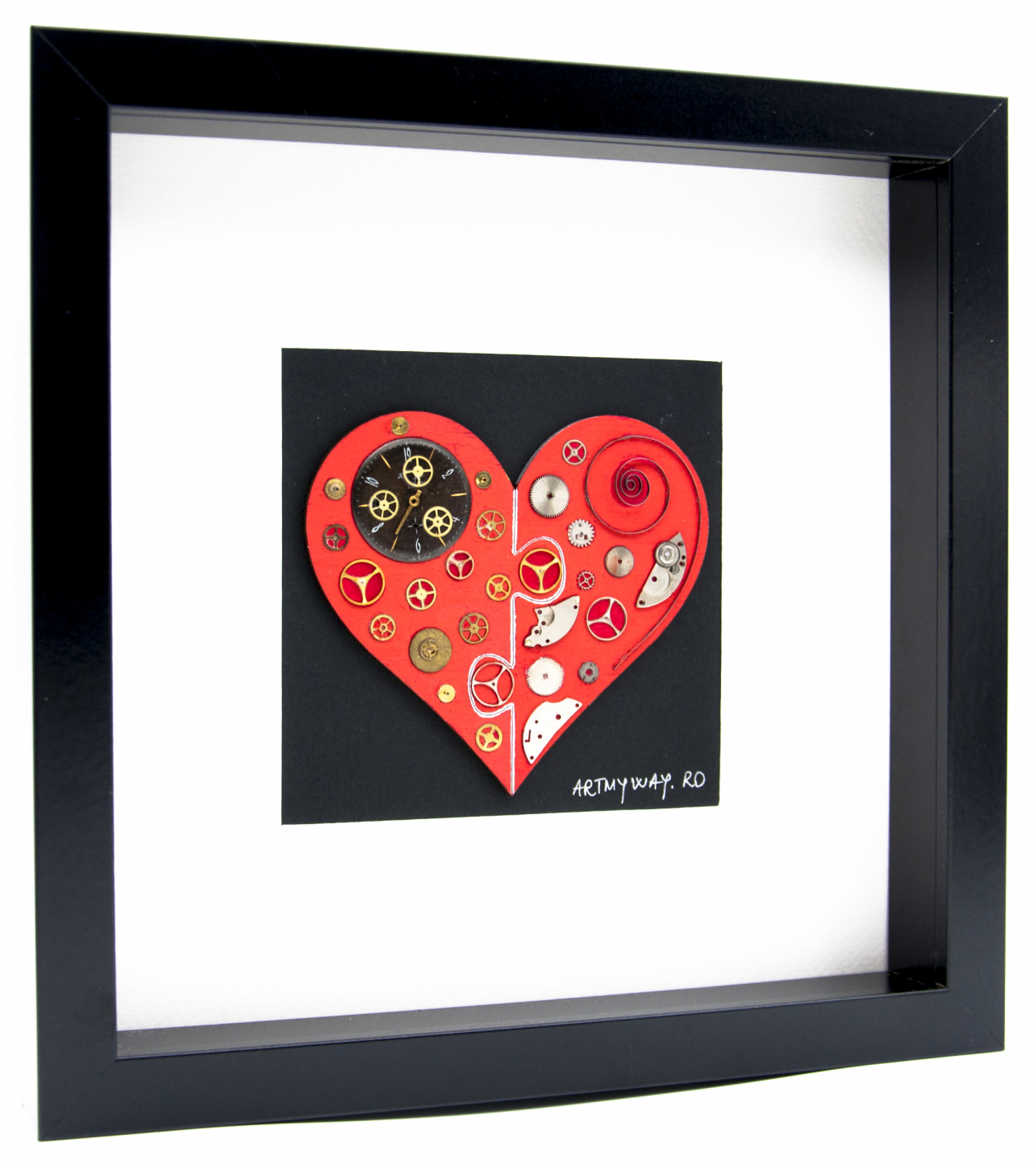 Tabloul 3D este realizat 100% manual, cu piese si mecanisme reconditionate de ceas si diverse piese metalice aplicate pe o macheta din lemn ce respecta in totalitate dimensiunile originale ale modelului, totul fiind incadrat intr-o rama eleganta din lemn.