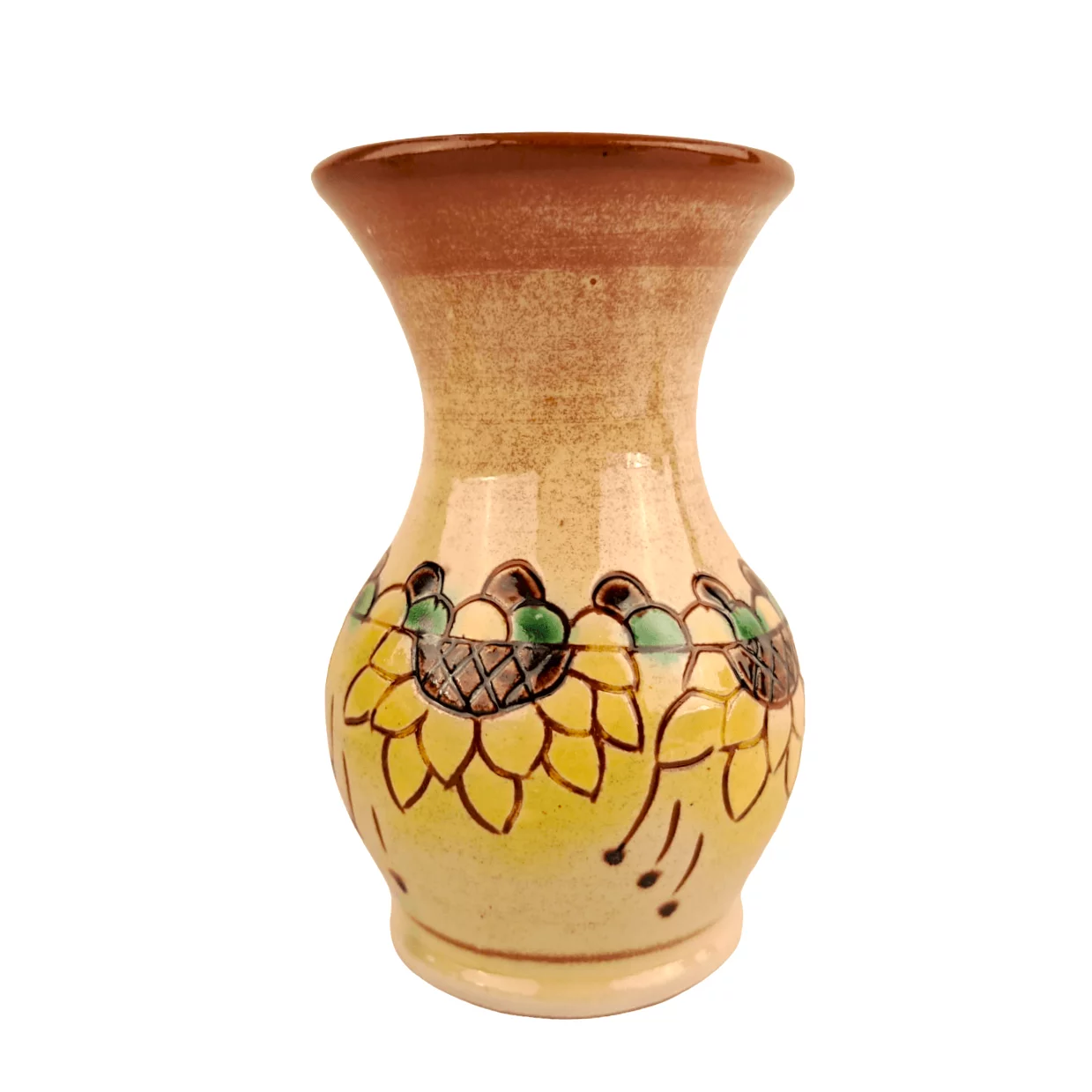 Această vază ceramică tradițională Kuty de 16 cm, lucrată și pictată manual în atelierele din Botoșani, este o piesă ce aduce în orice colț de casă o fărâmă din frumusețea lumii de odinioară. Cu modele inspirate din motive populare românești și o glazură lucioasă care dă profunzime culorilor, fiecare vază este unicat, purtând semnătura nevăzută a meșterului care a creat-o.