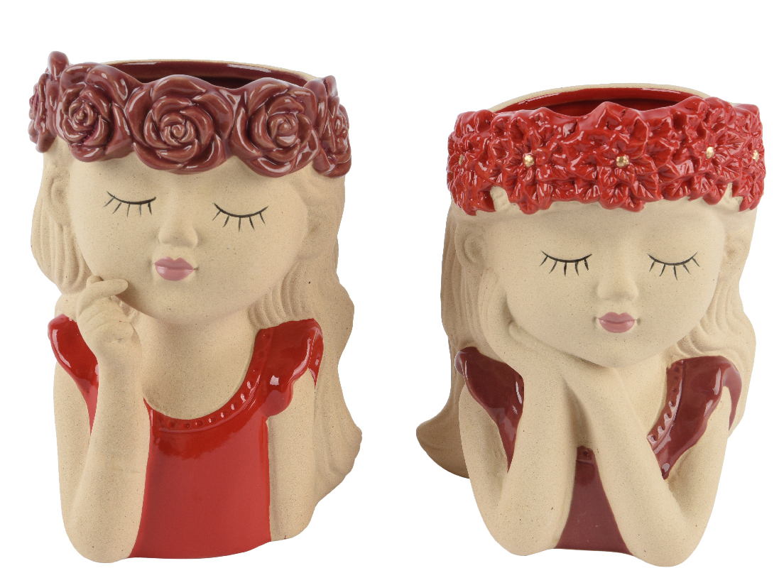 Adaugă un plus de farmec decorului tău de sărbători cu vaza Decoris, atrăgătoare și plină de personalitate. Concepută pentru utilizare în interior, această vază din ceramică are forma unei fetițe și este decorată cu flori de Crăciun – poinsettia și trandafiri – aducând o notă festivă și jucăușă în orice încăpere.