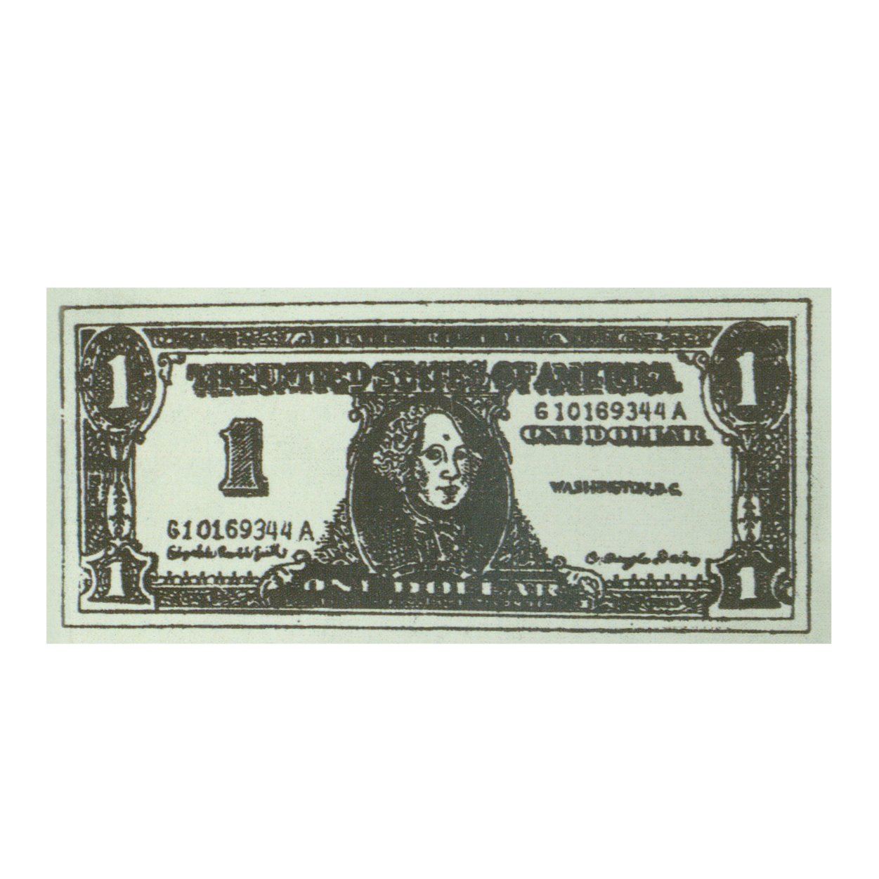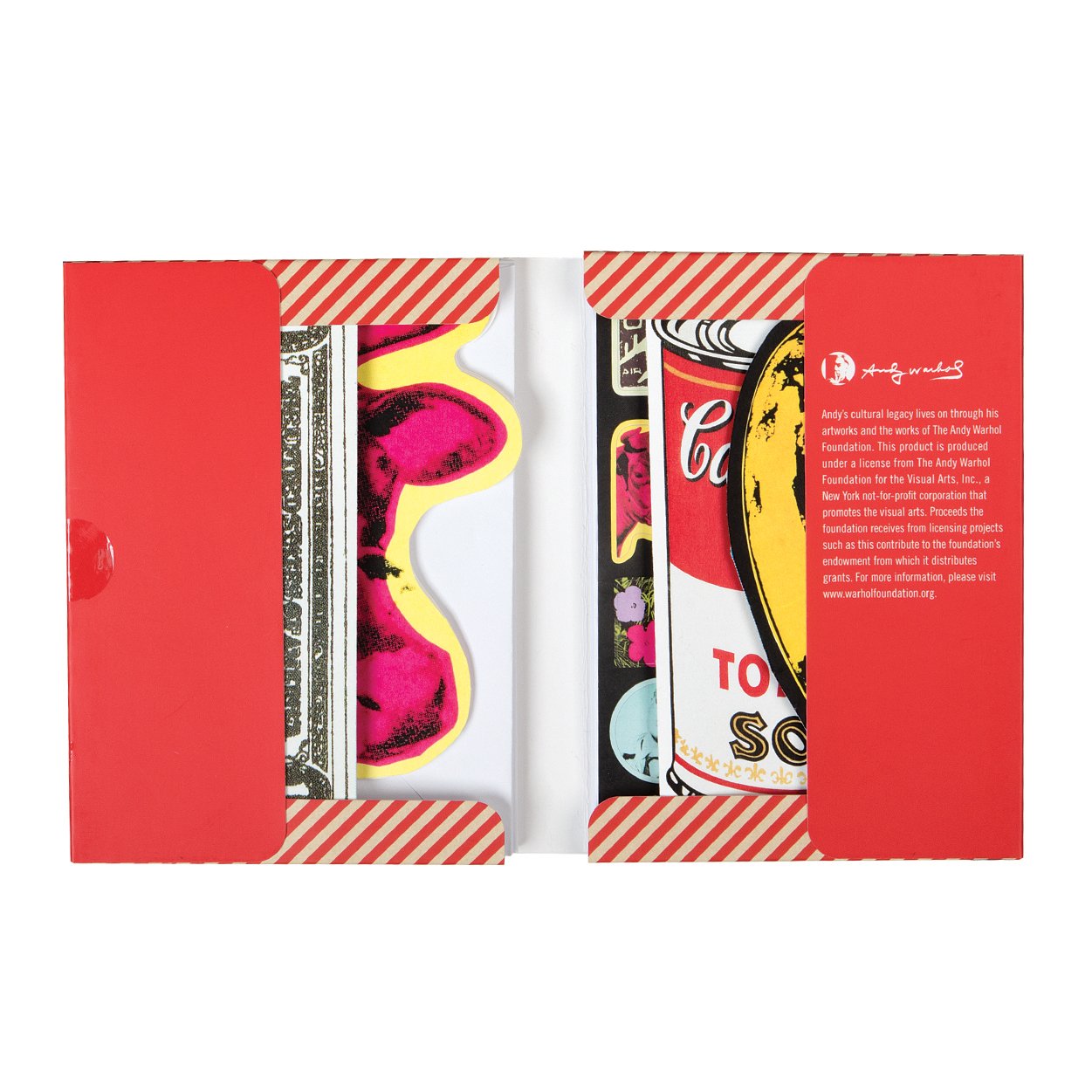 Carte poștală cu imagini emblematice Andy Warhol: vaca, banana, bancnota de un dolar sau cutia de supă Campbell.