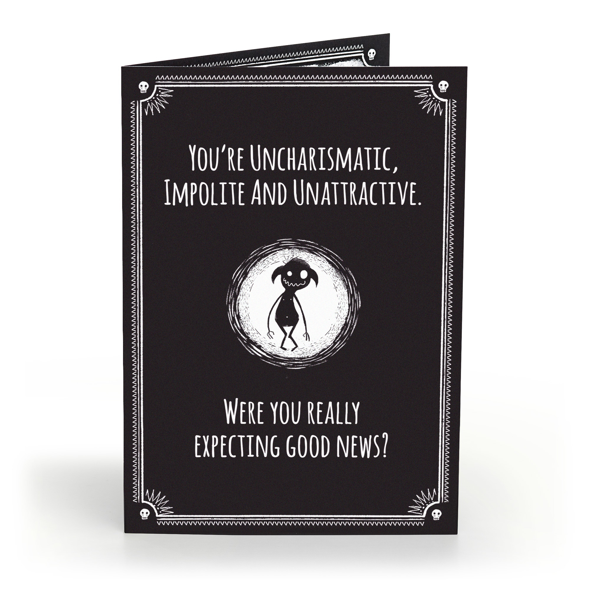 Prin avion, pe măgar, camilă, cu trenul sau dăruită personal, mesajul tău necioplit va lua orice supărare de pe cap. Pe o hartie premium de înaltă calitate de 320 g, această anti-felicitare îți oferă spațiu generos pentru a-ți scrie cuvintele putrede și cele mai amare urări de bine.