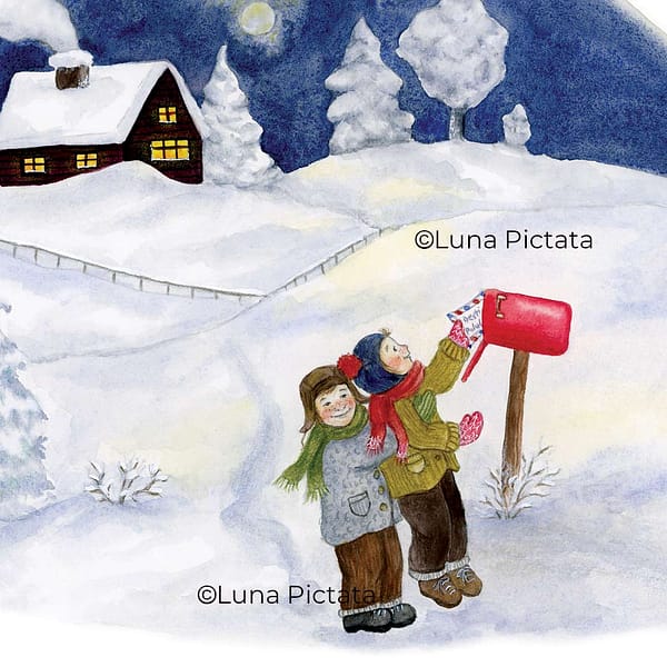 Descopera o felicitare de Craciun unica, cu un aer vintage, cu un peisaj de iarna si doi copii care ii trimit scrisoarea lui Mos Craciun. Ilustratia a fost pictata manual in acuarela. Ideala pentru cei care cauta felicitari deosebite si pline de caldura pentru a impresiona pe cei dragi.
