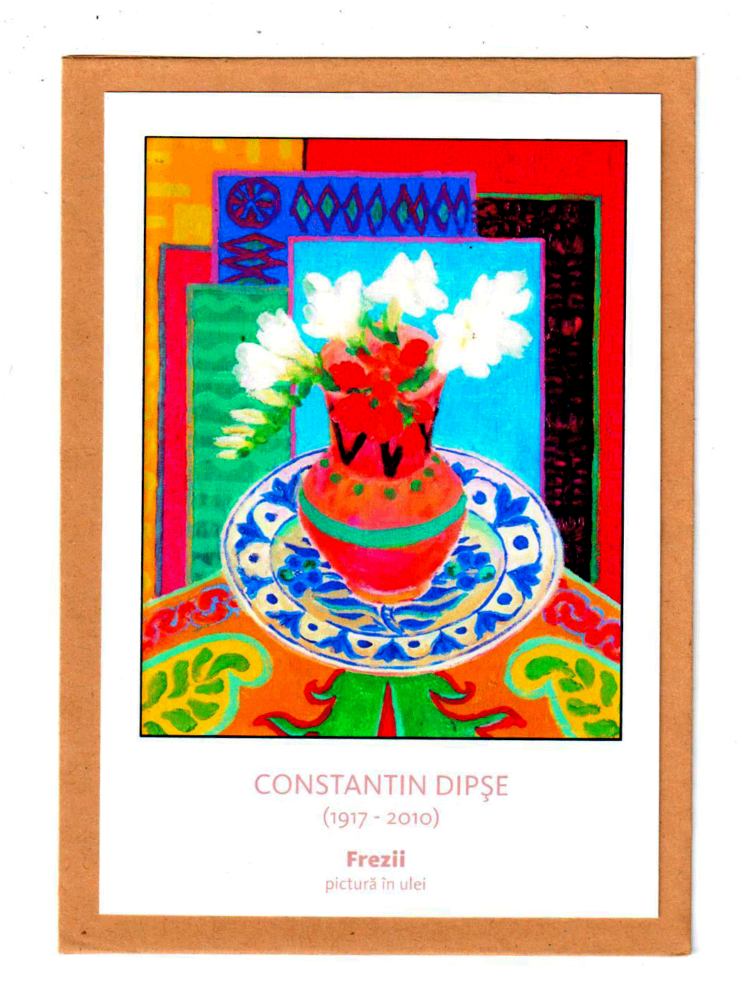 Felicitarea ilustrează celebra pictură în ulei, Frezii, realizată de pictorul Constantin Dipșe.