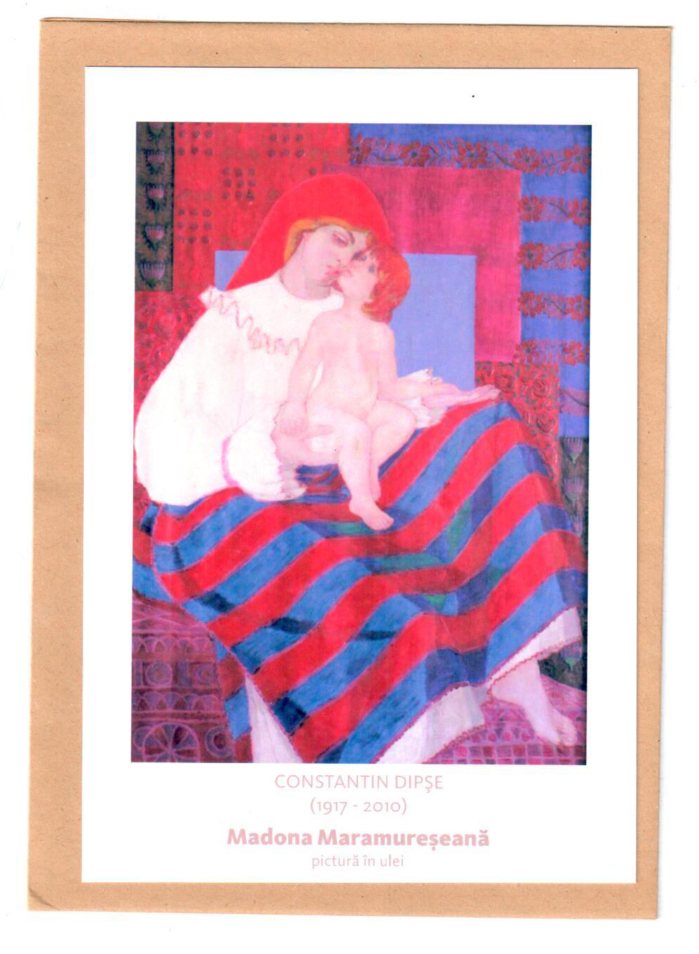 Felicitarea ilustreaza celebra pictură în ulei, Madona Maramureseana realizată de pictorul Constantin Dipșe.