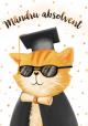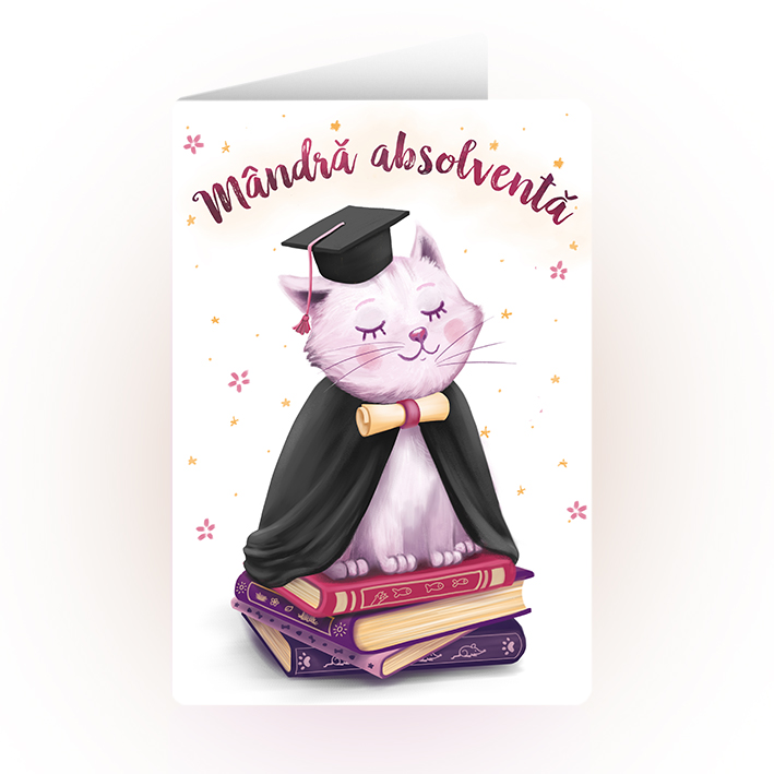 Felicitare cu o pisicuță albă cu tocă pe cap, și textul „Mândră absolventă”. Se alătură perfect unui cadou dat din suflet.