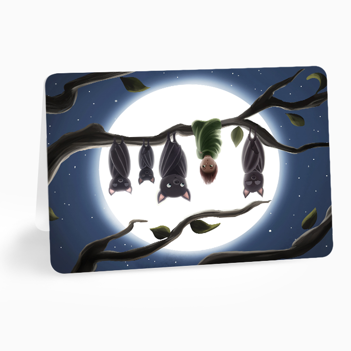 Felicitare cu micuța zână Lia stând pe o creangă cu capul în jos, împreună cu liliecii. Se alătură perfect unui cadou dat din suflet.