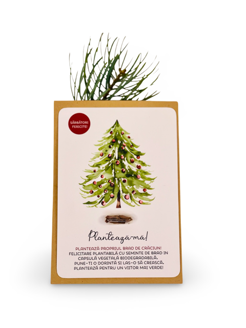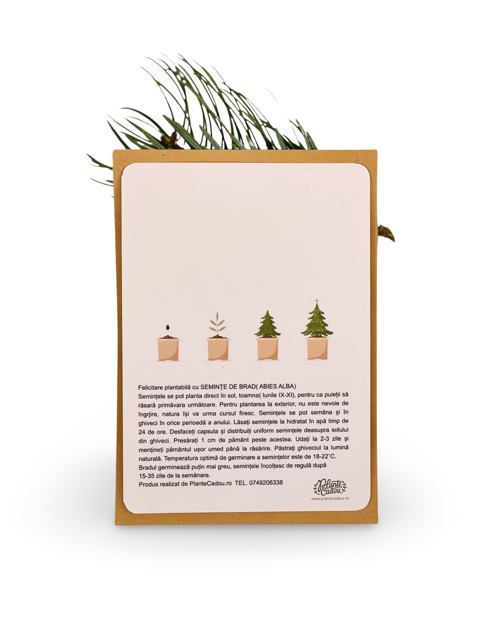 Felicitate plantabila 10X15 cm cu capsula biodegradabilă cu semințe de brad. Felicitarea include instrucțiuni complete de semănare și creștere, plic de hârtie kraft și folie de protecție.Semințele se pot planta direct în sol, în zona de munte, toamna, pentru ca puieții să răsară primăvara următoare.Pentru plantarea la exterior, nu este nevoie de îngrjire, natura își va urma cursul firesc.Pentru plantarea la exterior, nu este nevoie de îngrjire, natura își va urma cursul firesc.Semințele se pot semăna în ghiveci în orice perioadă a anului. Lăsați semințele la hidratat în apă timp de 24 de ore. Desfaceți capsula și distribuiți uniform semințele deasupra solului din ghiveci. Presărați 1 cm de pământ peste acestea. Udați la 2-3 zile și mențineți pământul ușor umed până la răsărire. Păstrați ghiveciul la lumină naturală. Temperatura optimă de germinare a semințelor este de 18-22˚C.Bradul germinează puțin mai greu, semințele încolțesc de regulă după 15-35 zile de la semănare. "