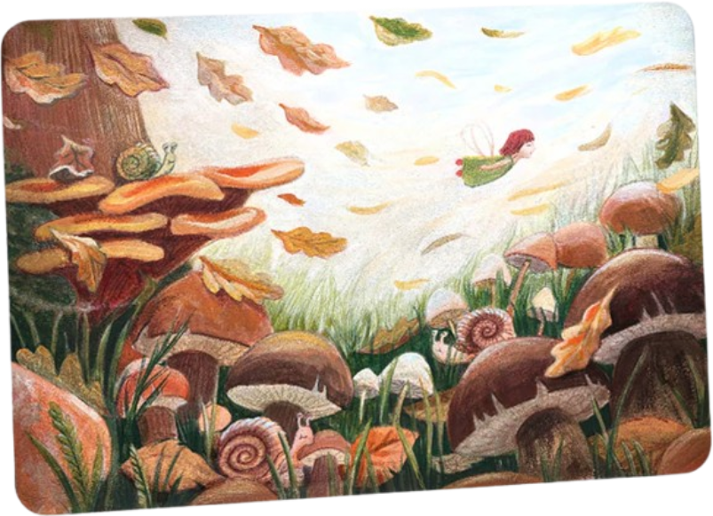 Felicitare cu micuța zână Lia plutind în aer cu frunzele de toamnă.