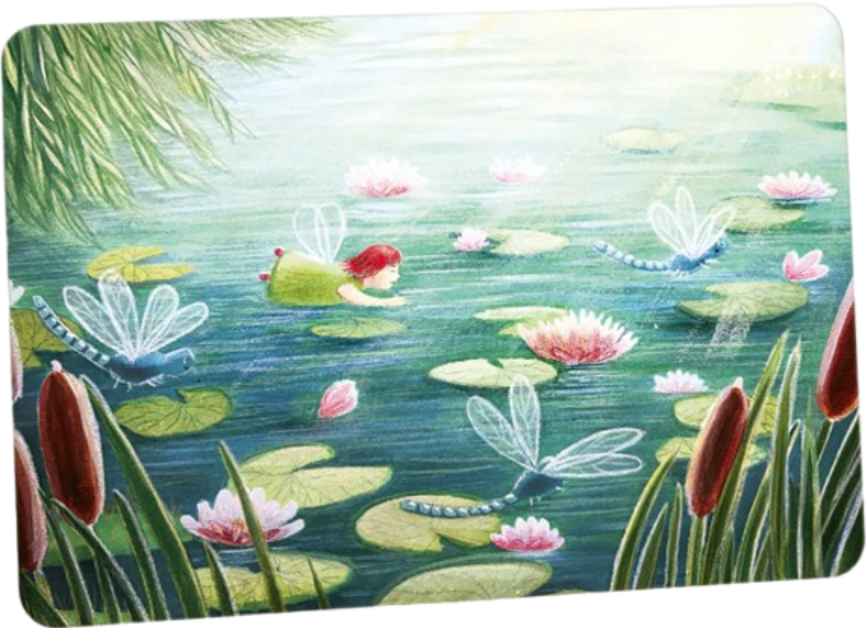 Felicitare cu micuța zână Lia jucând prinselea cu libelulele deasupra lacului cu nuferi.