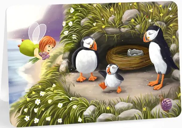 Felicitare cu micuța zână Lia în vizită pe insula pufinilor.