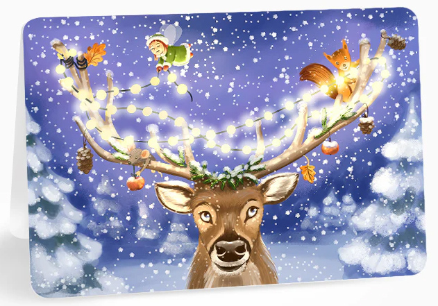Felicitare cu micuța zână Lia decorând coarnele renului împreună cu prietenii ei.