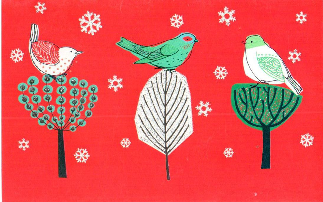 Felicitare decorată cu trei păsări. Vine însoțită de un plic.