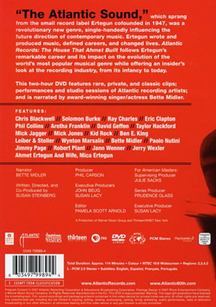 Ahmet Ertegun was a true visionary in the music business -- largely by being a fan of music. Although he was technically a "suit," he was a fan first and foremost. This fact defined his business instinct. Atlantic Records became one of the most important and successful record companies in history. From the beginning, if a record was graced by the famous Atlantic label and logo, the music within its grooves was bound to be magical. The Atlantic label remains a stamp of virtually guaranteed musical quality to this day. Atlantic's roster is truly mind-blowing, and it's impossible to list all of the artists here. Ahmet Ertegun's extraordinary career and the 60th anniversary of Atlantic is covered in 2007's fascinating two-hour, warts-and-all documentary DVD Atlantic Records: The House That Ahmet Built. The documentary -- written, directed, and co-produced by Susan Steinberg and narrated by Bette Midler -- was first broadcast on PBS as part of its American Masters series, which is produced by Thirteen/WNET New York. The non-stop parade of rare and classic clips, live performances, and studio sessions from Atlantic's legendary artists will make even casual music fans' jaws drop. Featured interview subjects, many of whom reminisce with Ahmet Ertegun himself, include Chris Blackwell, Solomon Burke, Ray Charles, Eric Clapton, Phil Collins, Aretha Franklin, David Geffen, the Rolling Stones' Mick Jagger, Foreigner's Mick Jones, Kid Rock, Ben E. King, Jerry Leiber, Mike Stoller, Wynton Marsalis, Paolo Nutini, Led Zeppelin's Jimmy Page and Robert Plant, Jann Wenner, and Ahmet Ertegun's wife, Mica Ertegun.
