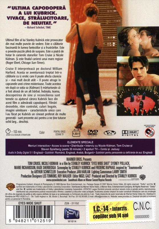 Eyes Wide Shut este un film indraznet al lui Stanley Kubrick. Este un voiaj psiho-sexual. Un vis bantuit. O poveste imbinata cu suspans. O “piatra de temelie” in cariera celor doua staruri - Tom Cruise si Nicole Kidman. “Un final meritos din cariera regizorului” (Roger Ebert, Chicago Sun-Times).