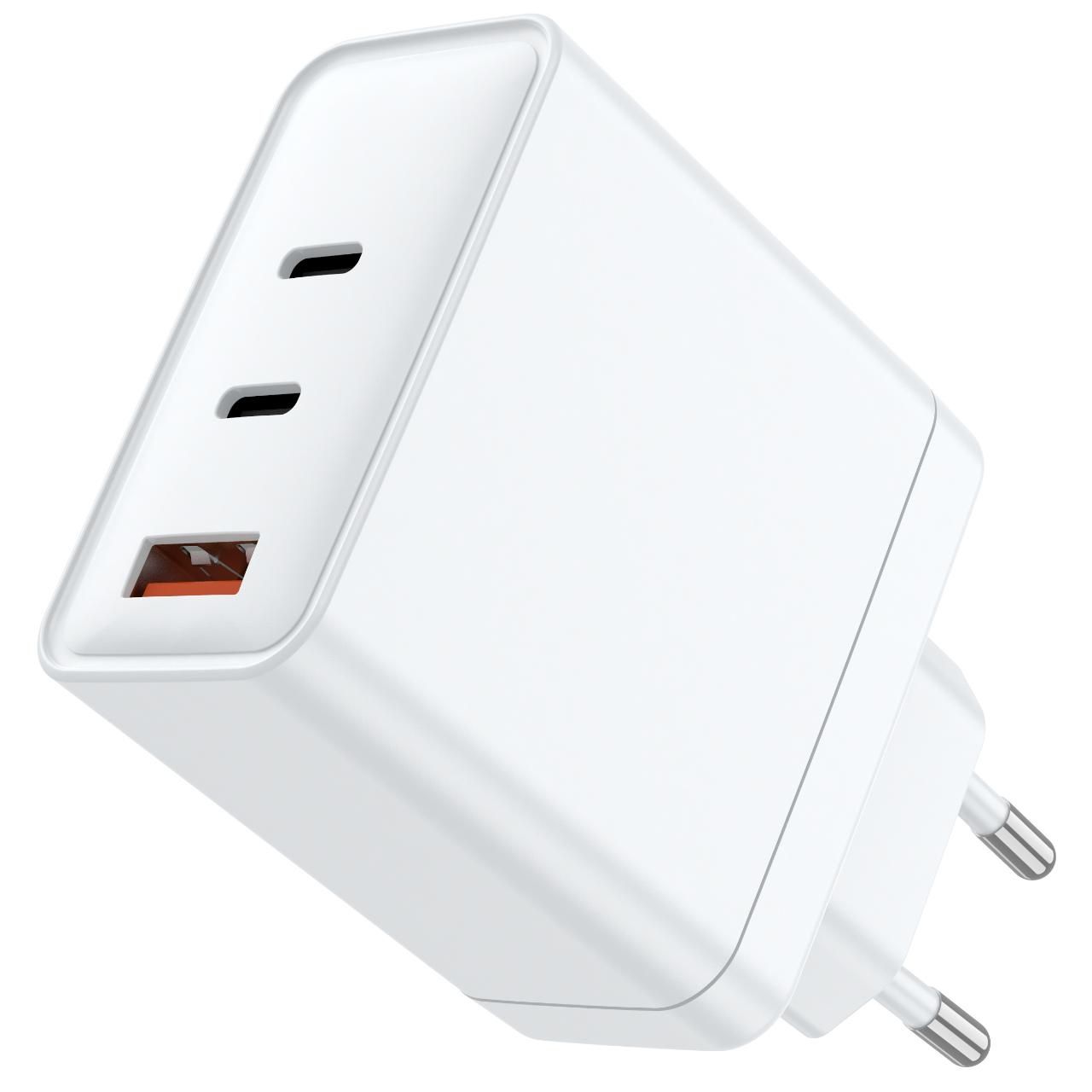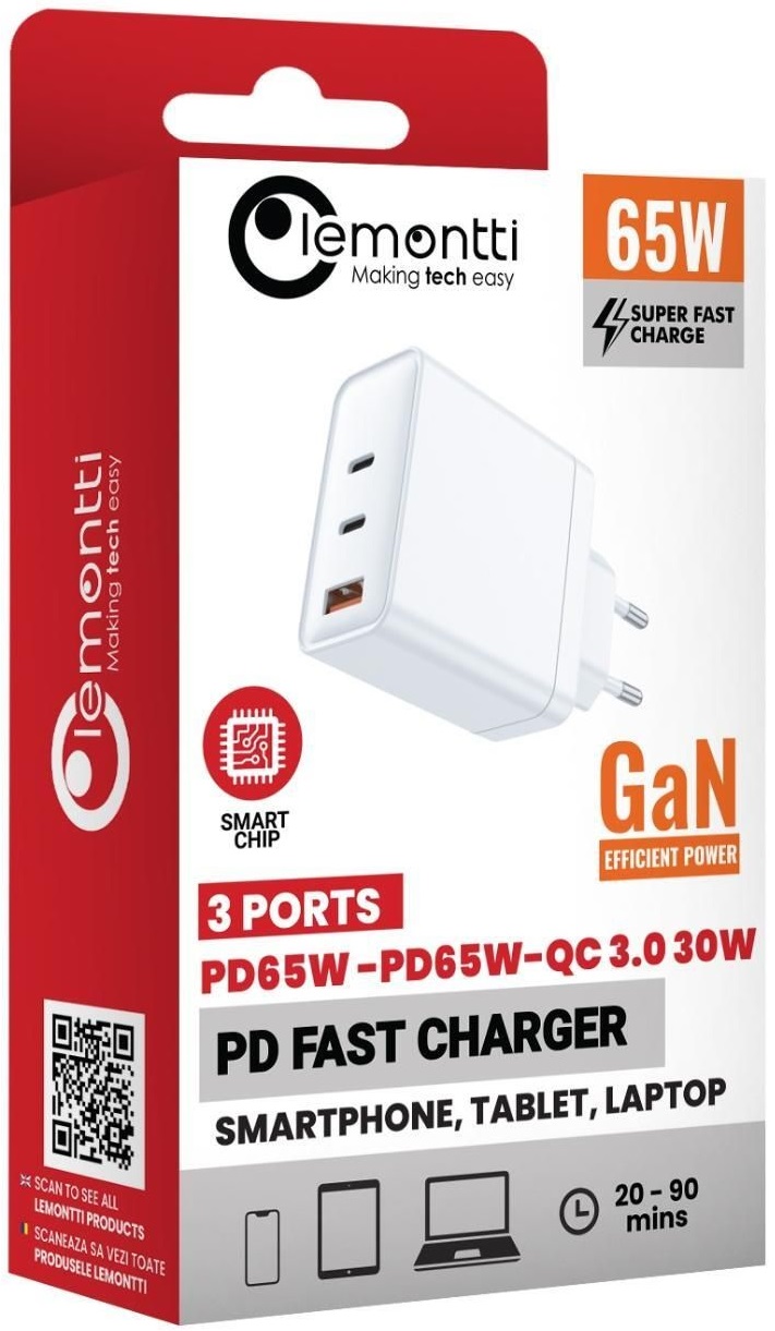 Lemontti Incarcator Retea GaN 2x Type-C si 1x USB-A, 65W, Fast Charge, EU Plug, Alb