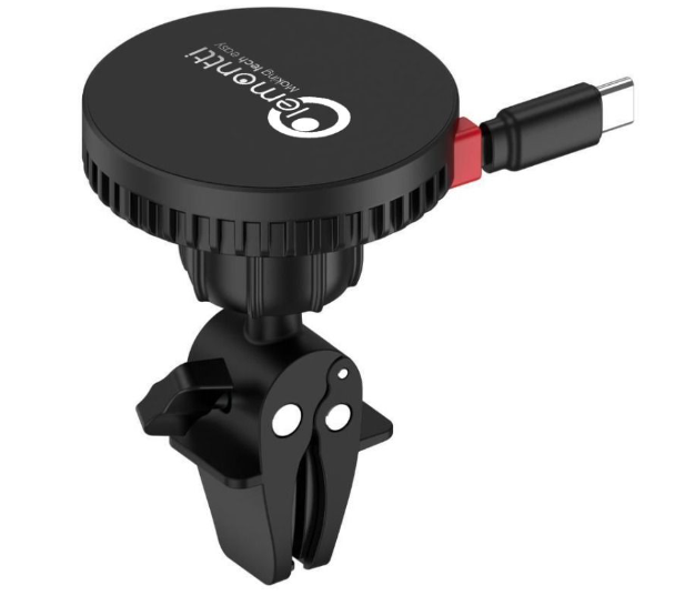 Lemontti Suport Auto Magnetic cu Incarcare wireless si cablu retractabil Type-C 1m, prindere ventilatie, Negru
