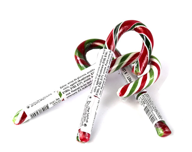 Acadele cu aromă de fructe (mere, căpșuni, lămâie, portocale) în formă de bastonașe de Crăciun.