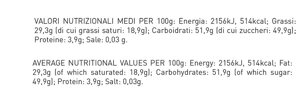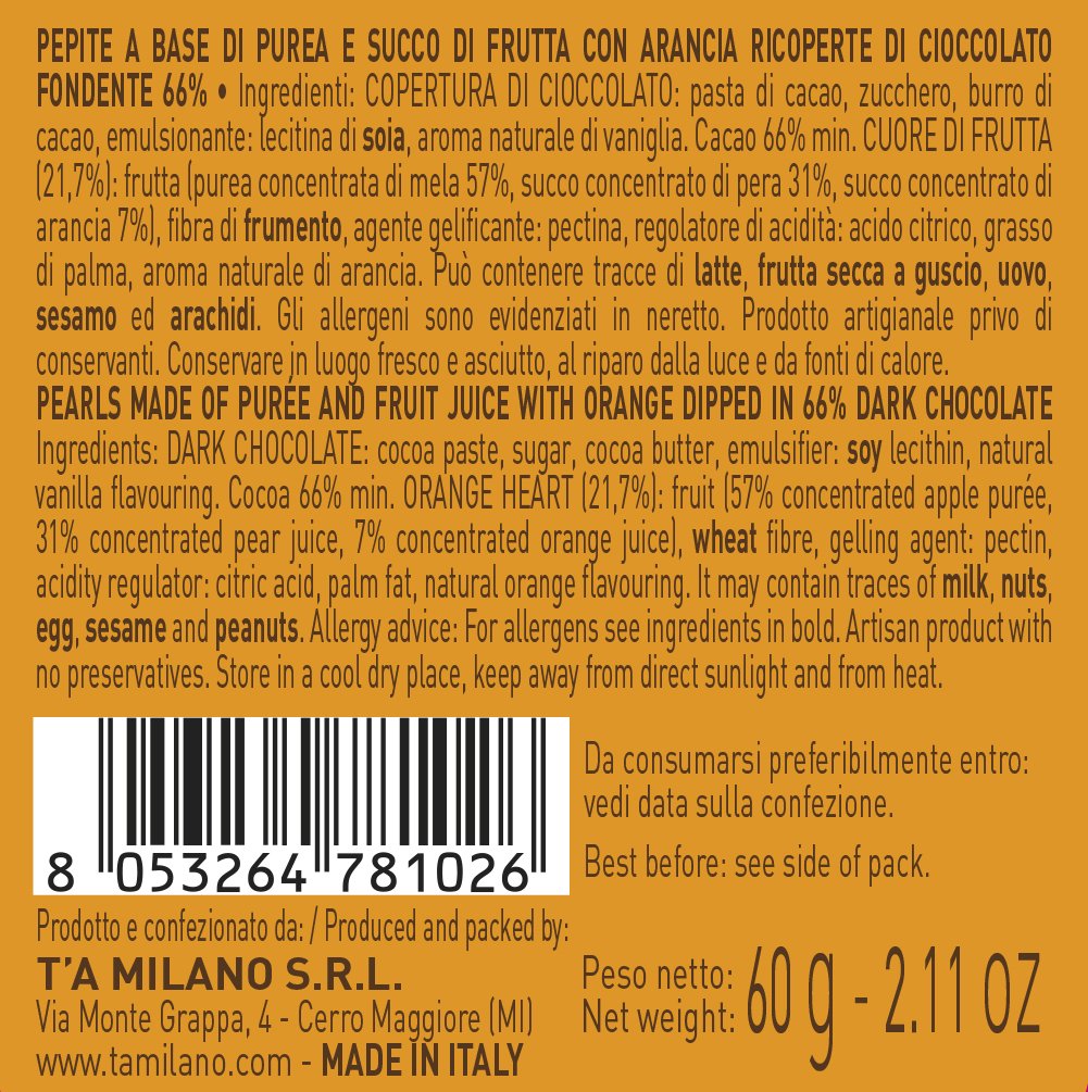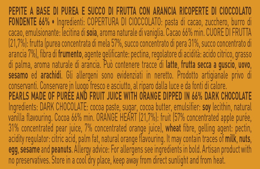 pastă de cacao, zahăr, unt de cacao, emulgator: lecitină din soia, aromă naturală de vanilie; cacao 66% min; din inimă de fructe (21,7%): fructe (mere piure de concentrat 57%, 31% concentrat de suc de pere, suc de portocale concentrat, 7%), fibre de grâu, agent de gelificare: pectina, regulator de aciditate: acid citric, palmier gras, aroma naturala de portocale. A se păstra într-un loc uscat și răcoros.