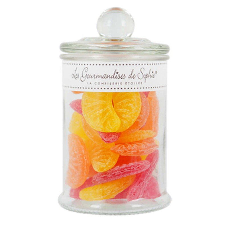 Zaharoza, sirop de glucoza din grau, acidifiant, aroma naturala de portocale, grapfruit si lamaie, zahar de pudra, apa.