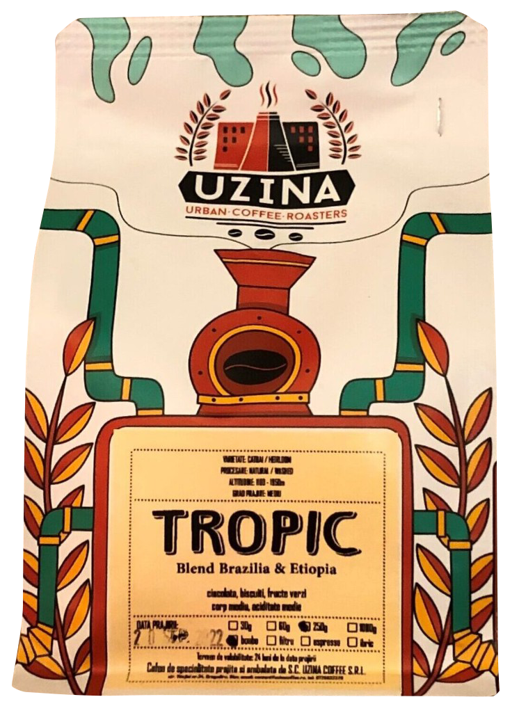„Tropic” este un amestec dintre două origini care se completează de minune. Amestecul dintre Brazilia și Etiopia se concentrează în corp mediu, aciditate ușoară, note de fructe verzi, ciocolată și grapefruit.