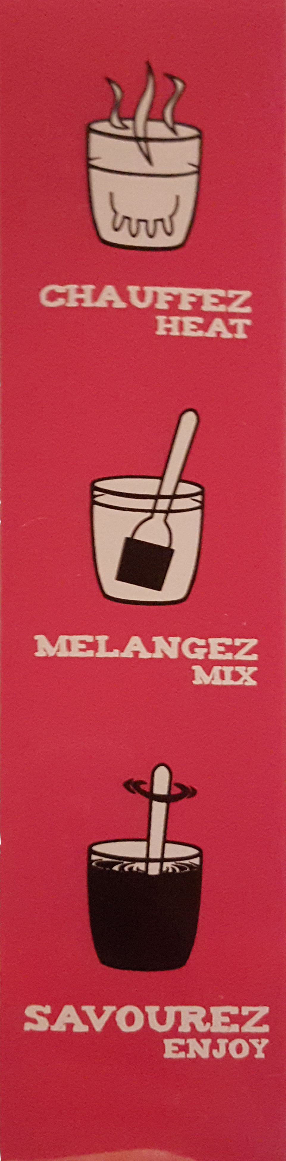 Ciocolată cu lapte (pentru ciocolată caldă): zahăr, 24% unt de cacao, 22,5% lapte praf integral, 11% masă de cacao, lecitină de soia, vanilie.