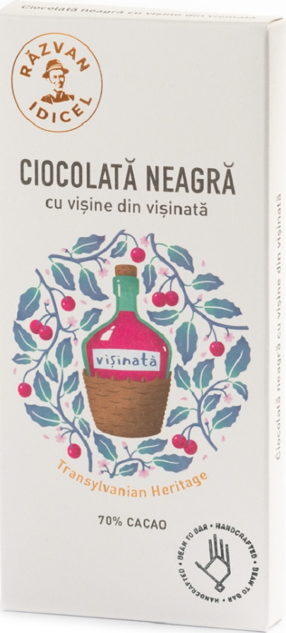 Mi-s ciocolată artizanală românească, neagră, doar puțin amăruie, peste care am pus cireșe ținute în vișinată. Ciocolata artizanală Răzvan Idicel îți bucură gustul și îți aduce fericire, fiind făcută cu artă, maiestrie și pasiune, doar din ingrediente naturale.