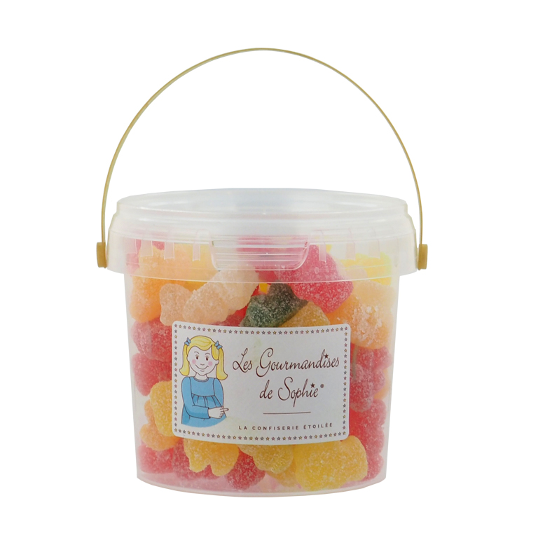Zahar, sirop de glucoza, apa, gelatina, acidificator: E296, E334, arome (para, mar, zmeura, capsuna, portocala, lamaie), coloranti: E120, E100, E141