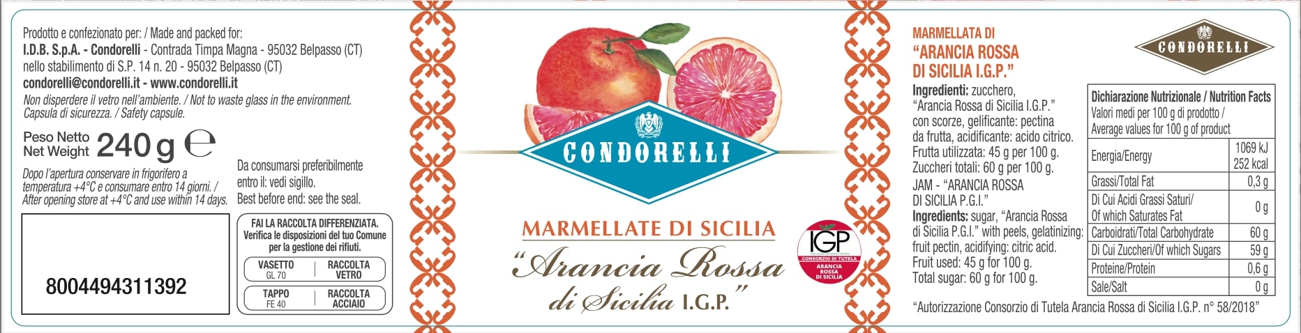 Zahar, portocale rosii de Sicilia, gelifiant, pectina din fructe, acidifiant, acid citric.