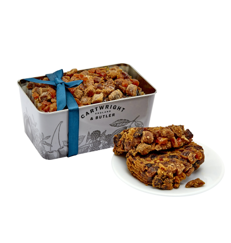 O prăjitură umedă, ușor condimentată, plină de fructe (caise și somochine), cu 40% stafide sultana, ambalată într-o cutie de metal, un acompaniament ideal la o cană cu ceai.