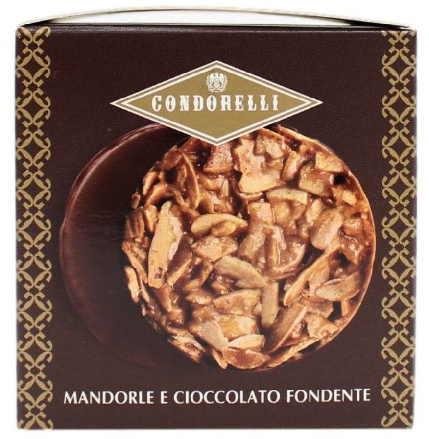 Condorelli Lune: Fulgi crocanți de migdale și fistic cu ciocolată neagră și ciocolată albă. Fulgi crocanți de migdale sau fistic, prăjiți cu măiestrie de cofetarii noștri și acoperiți cu ciocolată neagră sau albă. Pachetul conține 3 fulgi de migdale și 3 fulgi de fistic, ambalate individual. Produs fără gluten. Cutie de 120 g.