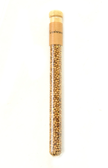 Tub de sticla care contine coriandru boabe.