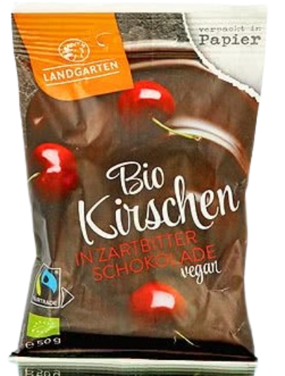 Ciocolata neagra* 89% (masa de cacao*, zahar din trestie*, unt de cacao*, pudra de cacao puternic deuleiata*, emulgator: lecitina (soia*)), visine liofilizate* 10%, agent de glazurare: guma arabica*, zahar*, dextroza*