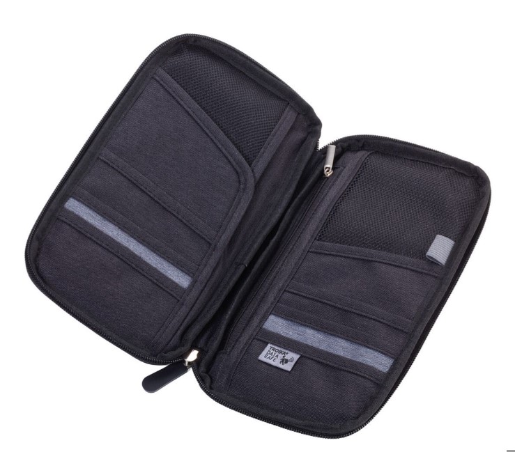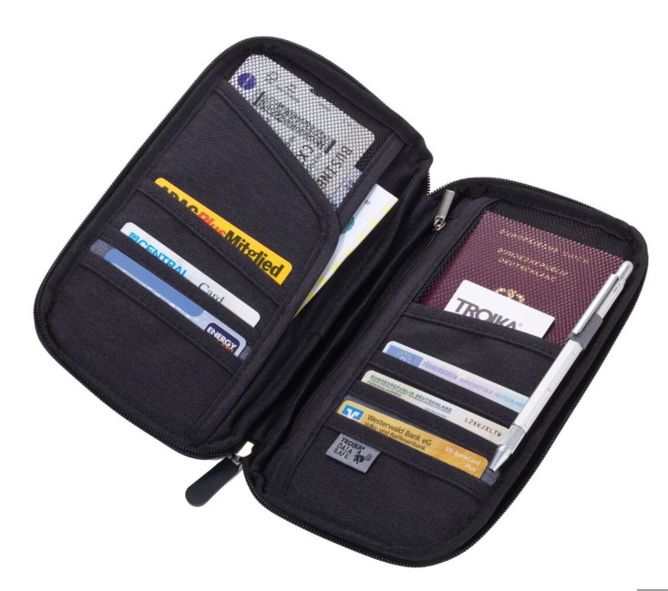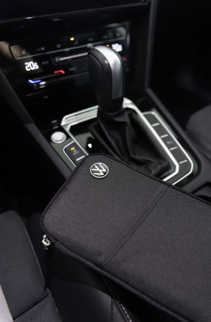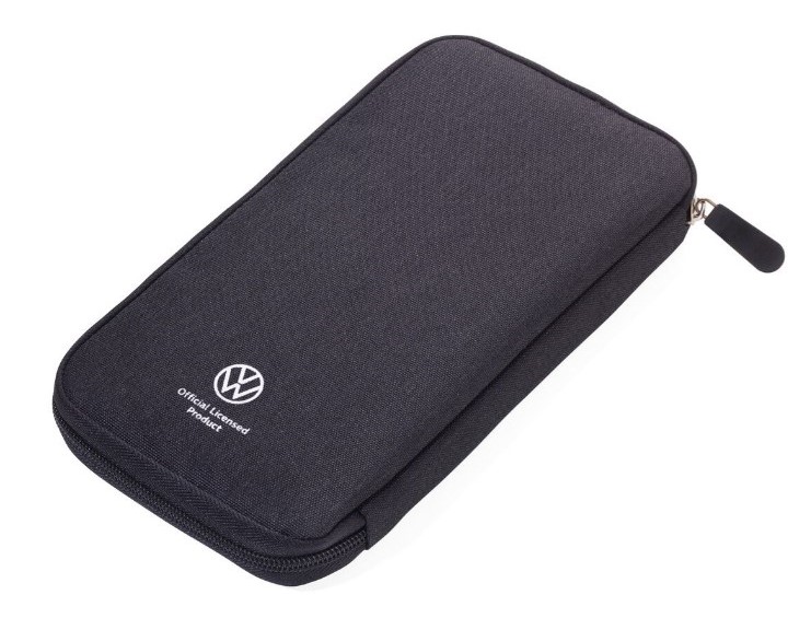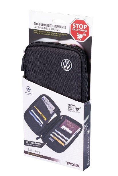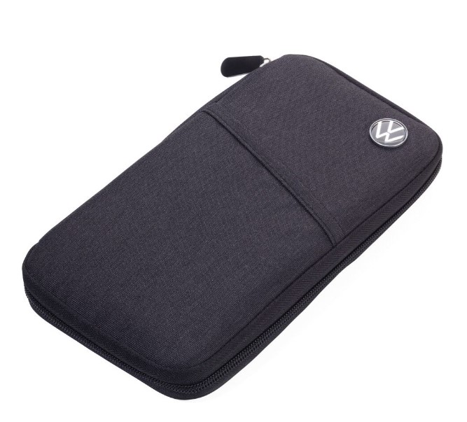 Husă pentru documente de călătorie cu logo VW cu folie de protecție pentru citire (pentru cipuri RFID), 12 compartimente interioare pentru permisul de conducere, document de înmatriculare a vehiculului, carduri pentru cluburi auto, carduri de service și combustibil, buclă pentru stilou.