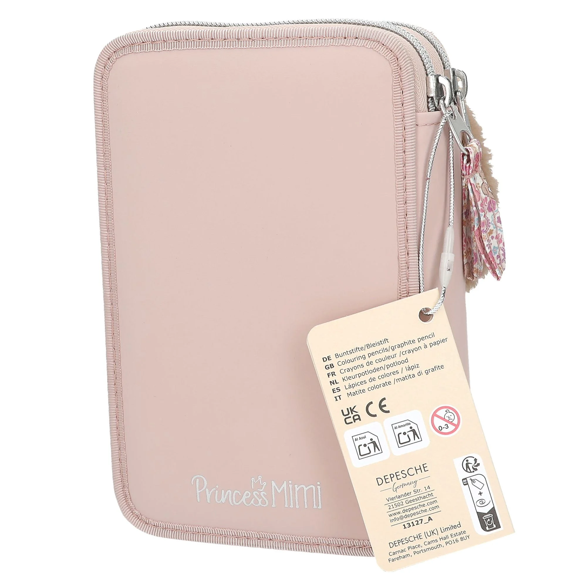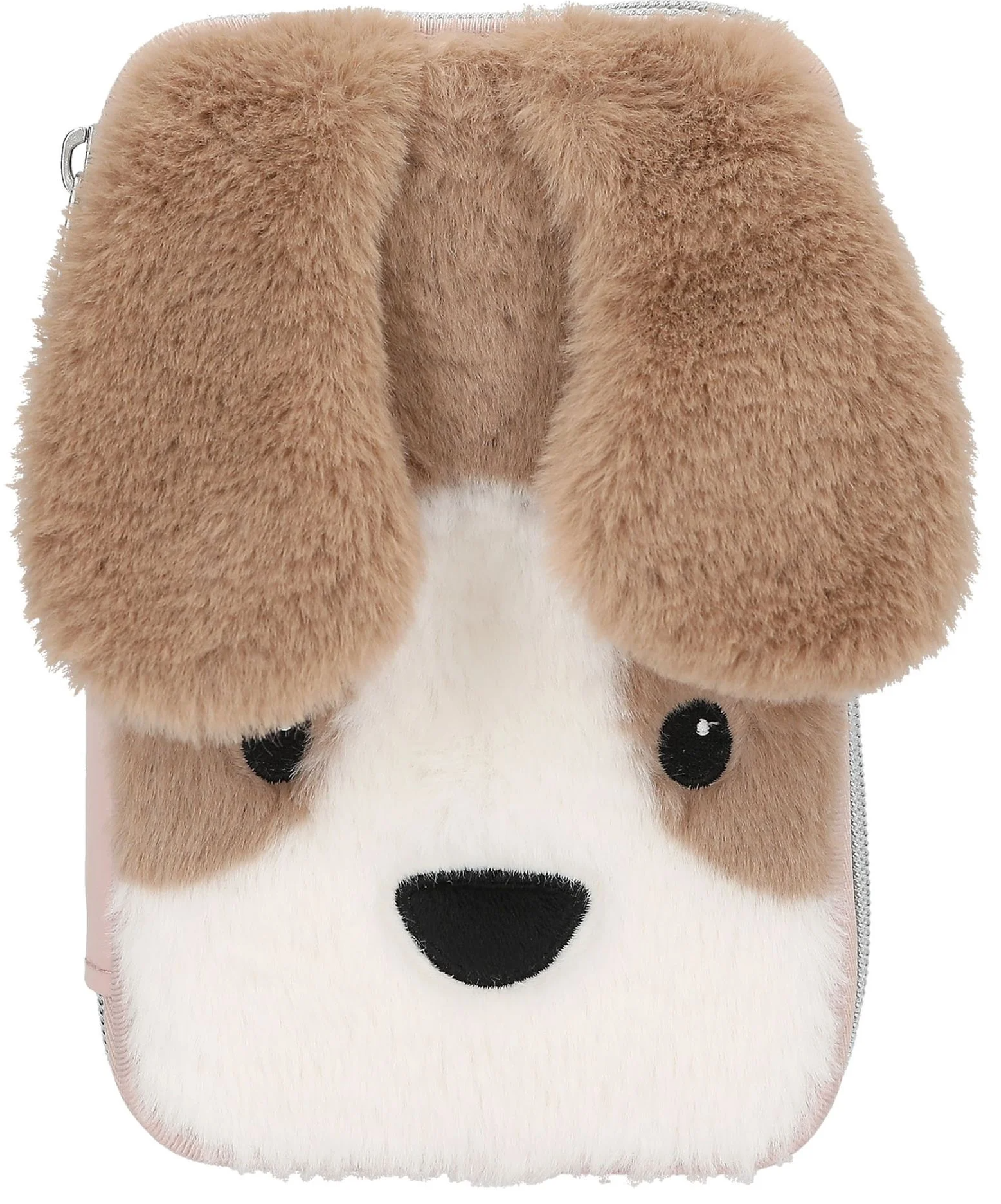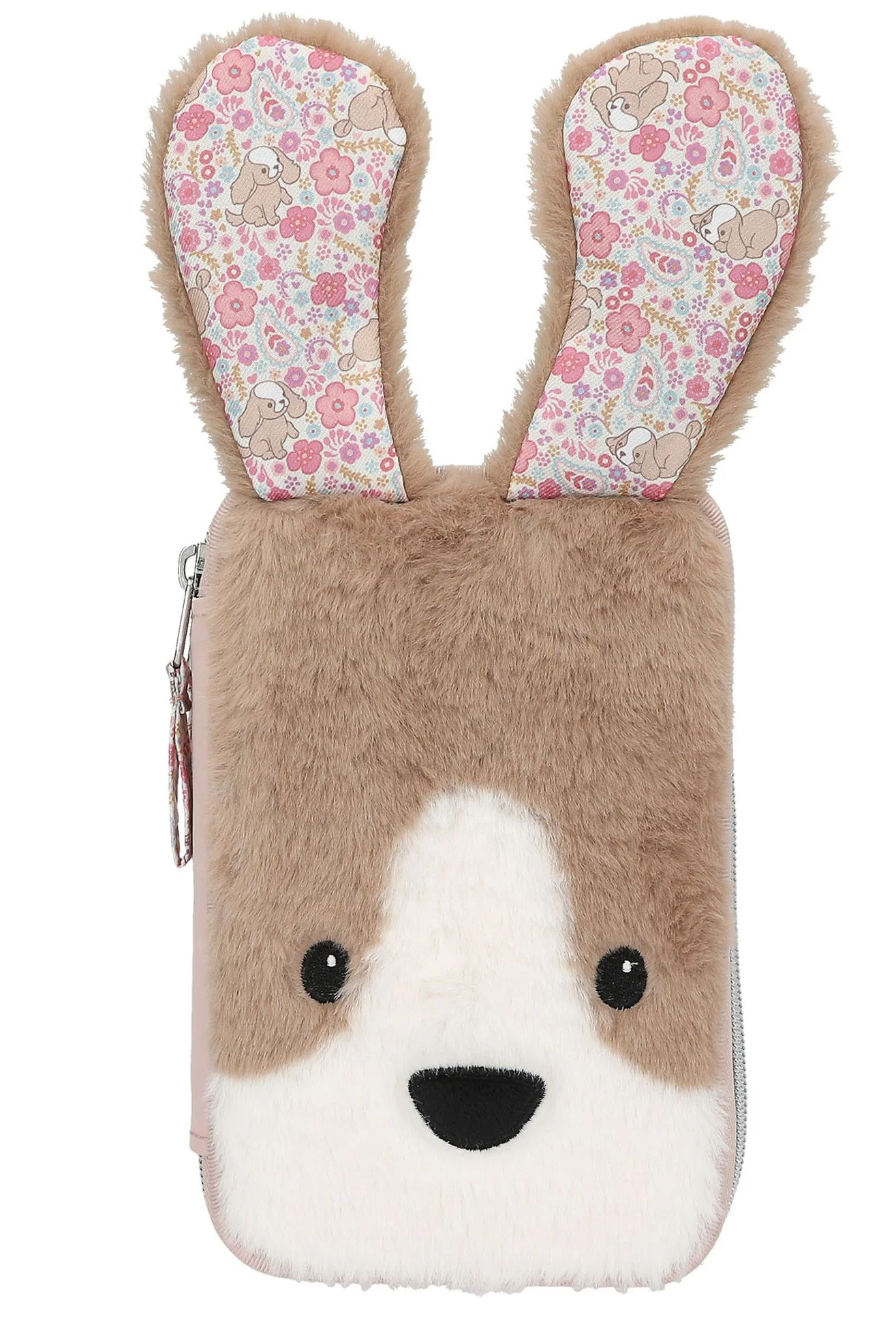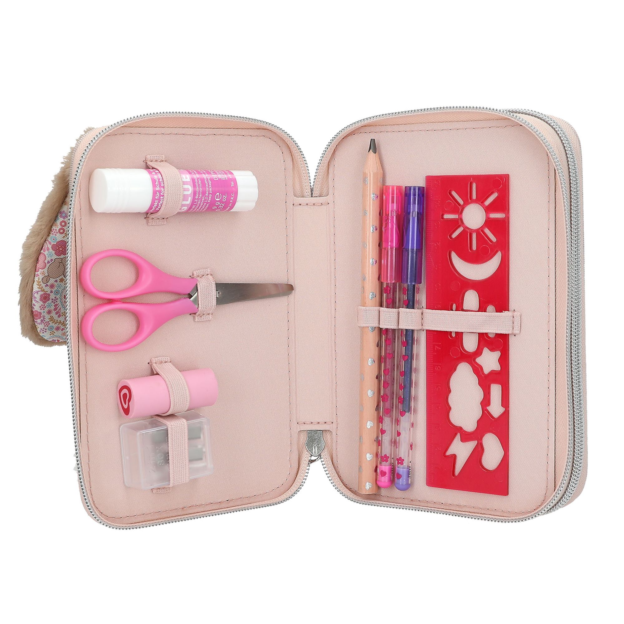 Woof, wow! Penarul super drăguț, pufoas, are o față drăguță de câine maro și alb, cu urechi lungi și catifelate pe partea din față cu blană. Ochii și nasul sunt brodate. Un model floral drăguț împodobește partea din spate a urechilor floate, din material textil. Cele două compartimente separate sunt complet echipate cu 12 creioane groase de colorat și 2 pixuri cu gel cu sclipici, precum și un creion gros, un ascuțitor dublu, o gumă de șters, o riglă cu șablon, foarfece și un lipici. De la Princess Mimi. Material: 100% poliamidă; față și căptușeală: 100% PES