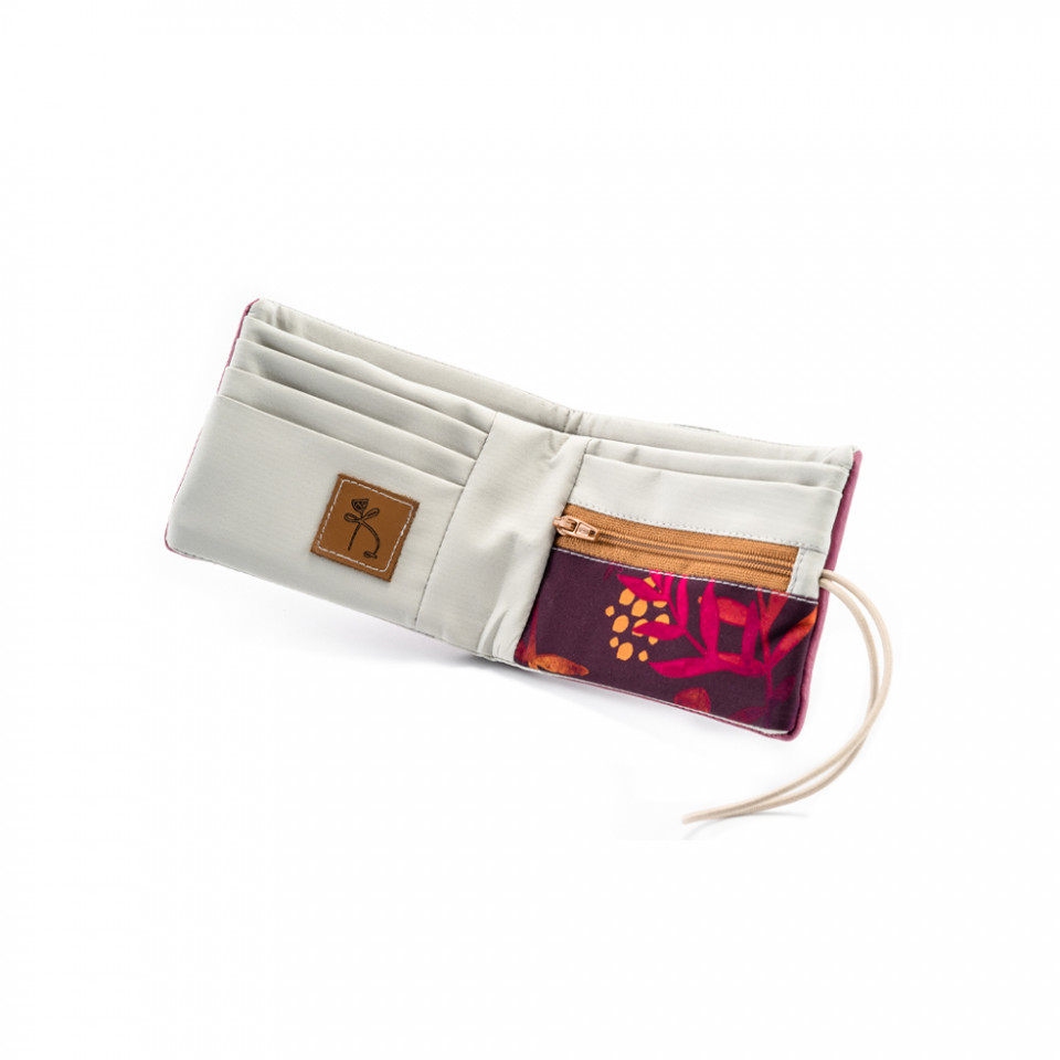 Interior: 3 buzunare pentru carduri bancare, 1 buzunar mai mare pentru buletin, 1 buzunar cu fermoar pentru monede, 1 buzunare pentru bancnote. Se închide cu elastic rotund.